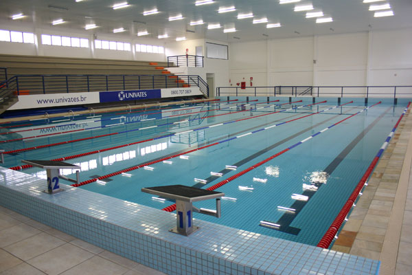 O prédio das piscinas possui piscina semiolímpica com oito raias apta a receber competições de nível internacional e piscina para realização de hidroginástica, além de arquibancadas, vestiários, sanitários, laboratórios e clínica para fisioterapia.