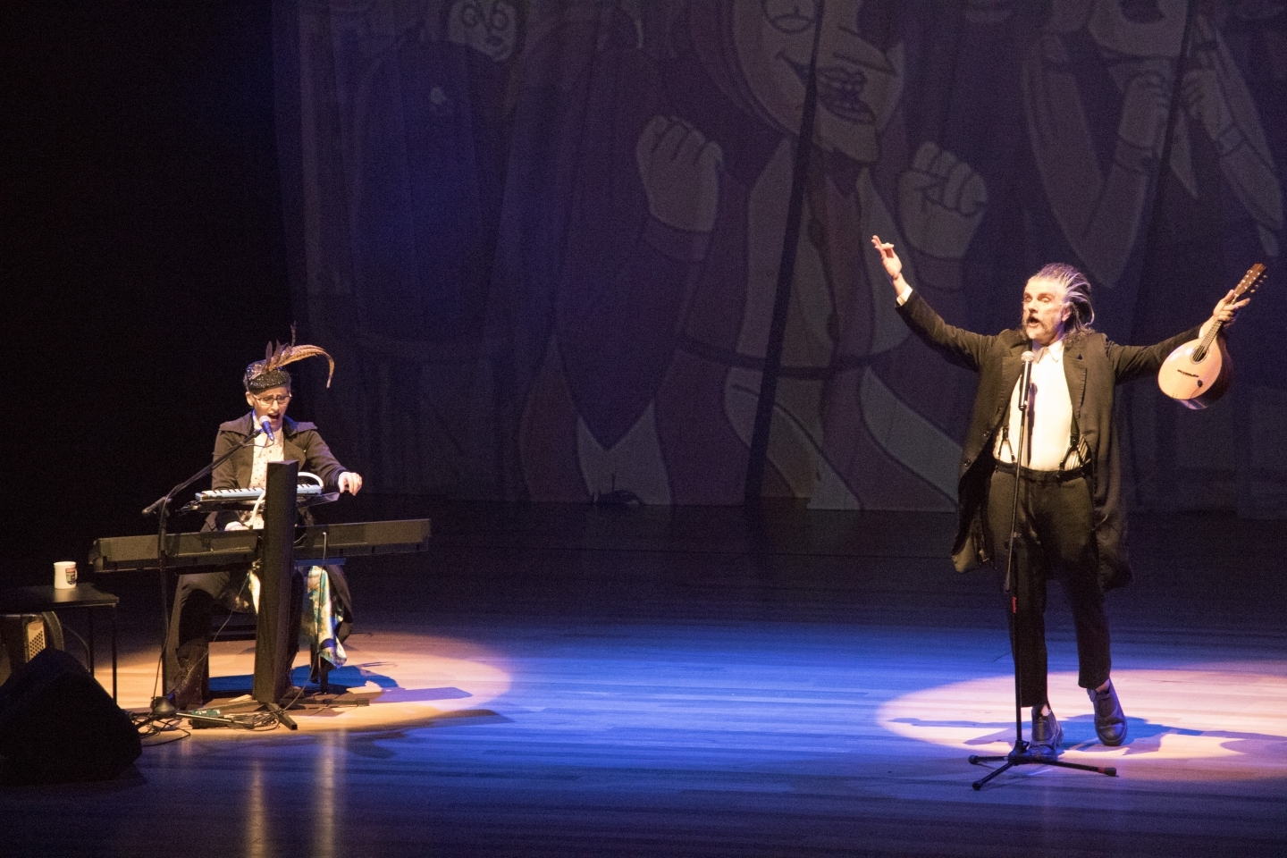 Os dois artistas encarnavam Kraunus Sang, com o seu violino delirante e o Maestro Plestkaya com seu acordeon de efeitos fantásticos, e contavam a hilária estória de seu país de origem, a