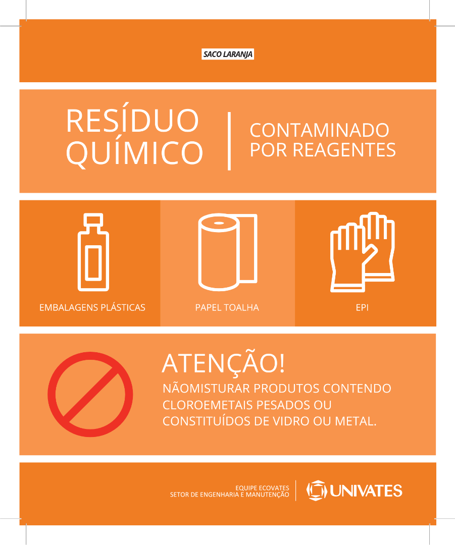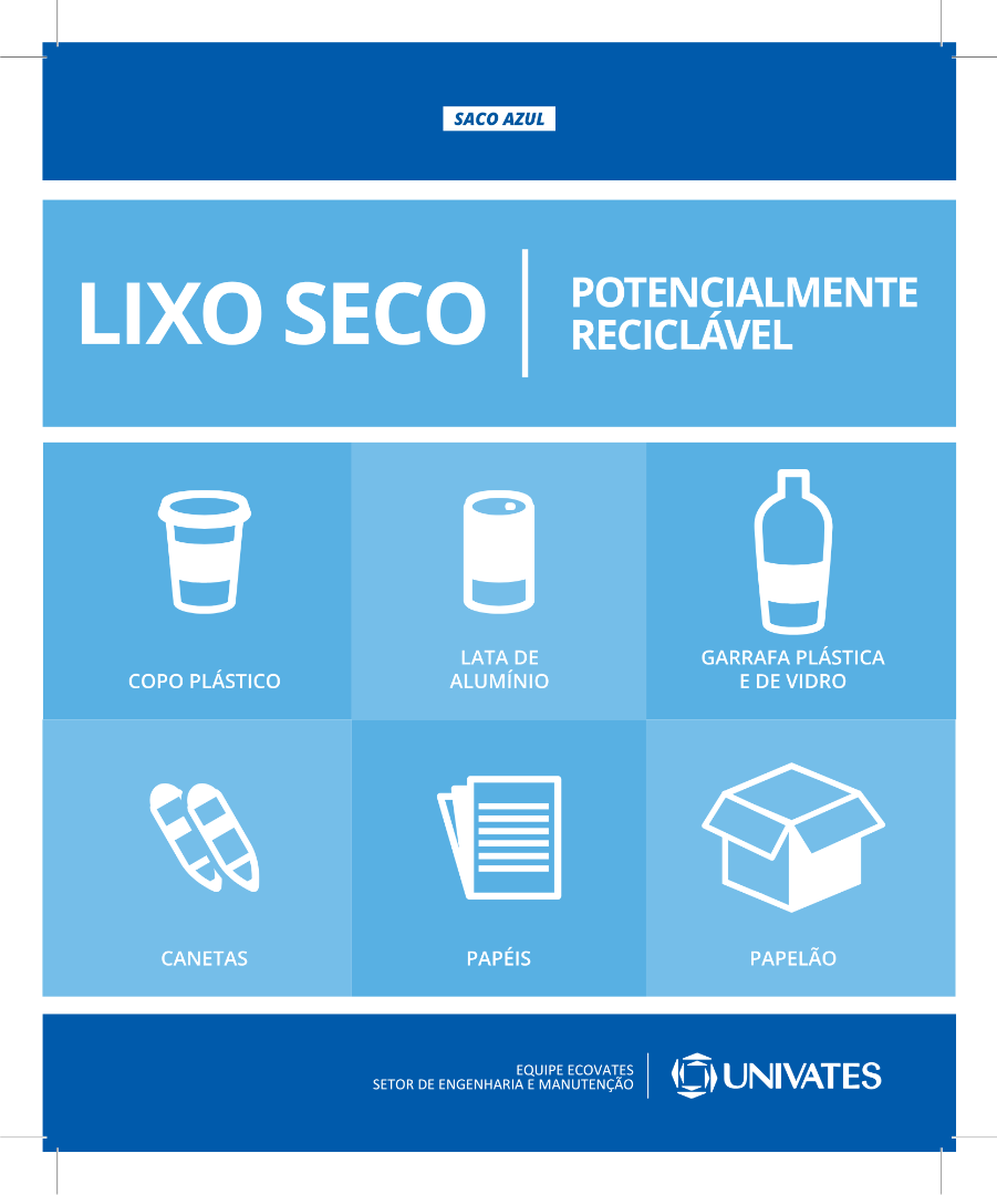 Na Universidade do Vale do Taquari, o Ecovates é a equipe responsável por identificar todos os coletores do campus, que estão designados conforme a geração de resíduos de cada local, de acordo com os adesivos abaixo:
