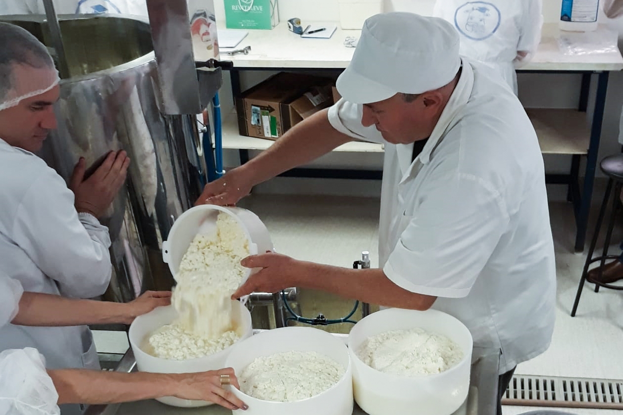 Na última sexta-feira, dia 23, os mestres queijeiros italianos Giuseppe Pellegrini e Attorni Battista ministraram na Univates um workshop sobre fabricação de queijos. Oferecida a profissionais da área e participantes do grupo de pesquisa do Programa de Pós-Graduação em Biotecnologia (PPGBiotec) da Instituição, a oportunidade tratou sobre a fabricação de um queijo meia-cura de 30 dias de maturação e, com o soro desse queijo, a produção de ricota.