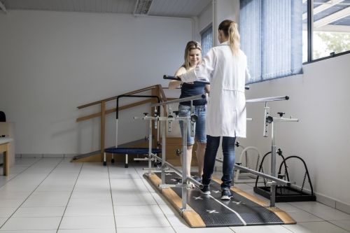 Principais recursos: escada de canto, barras paralelas, bolas e rolos terapêuticos, discos e pranchas de equilíbrio e propriocepção, minitrampolins, faixas elásticas, halteres e caneleiras de diferentes resistências