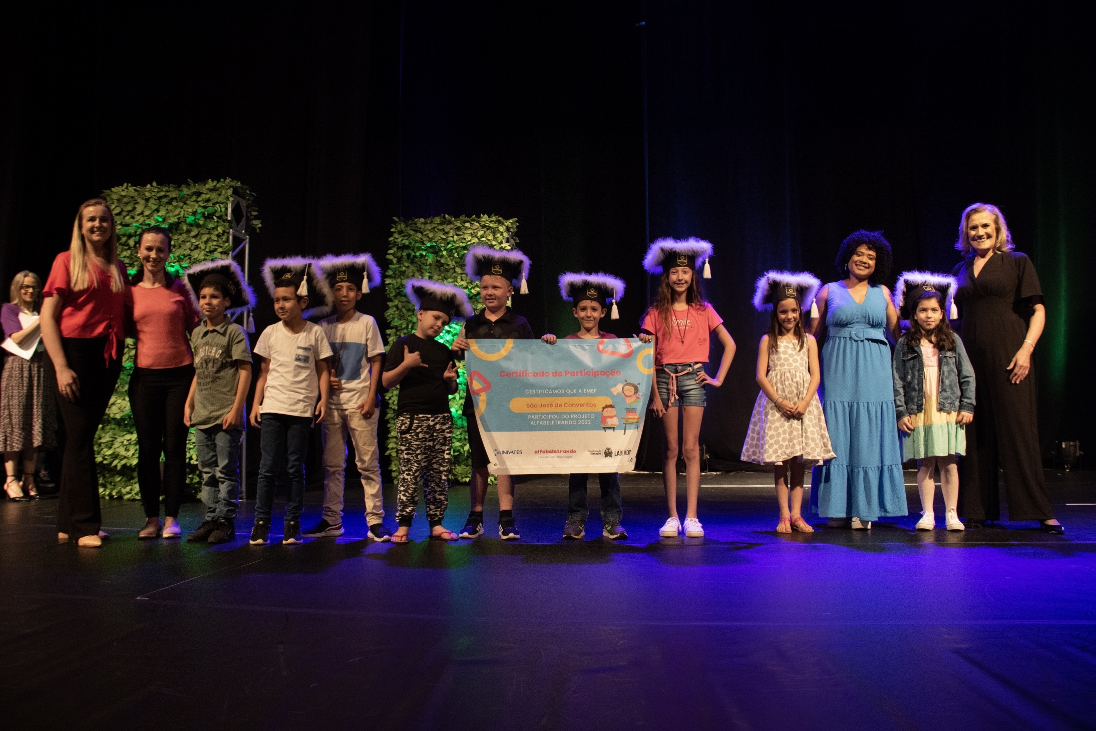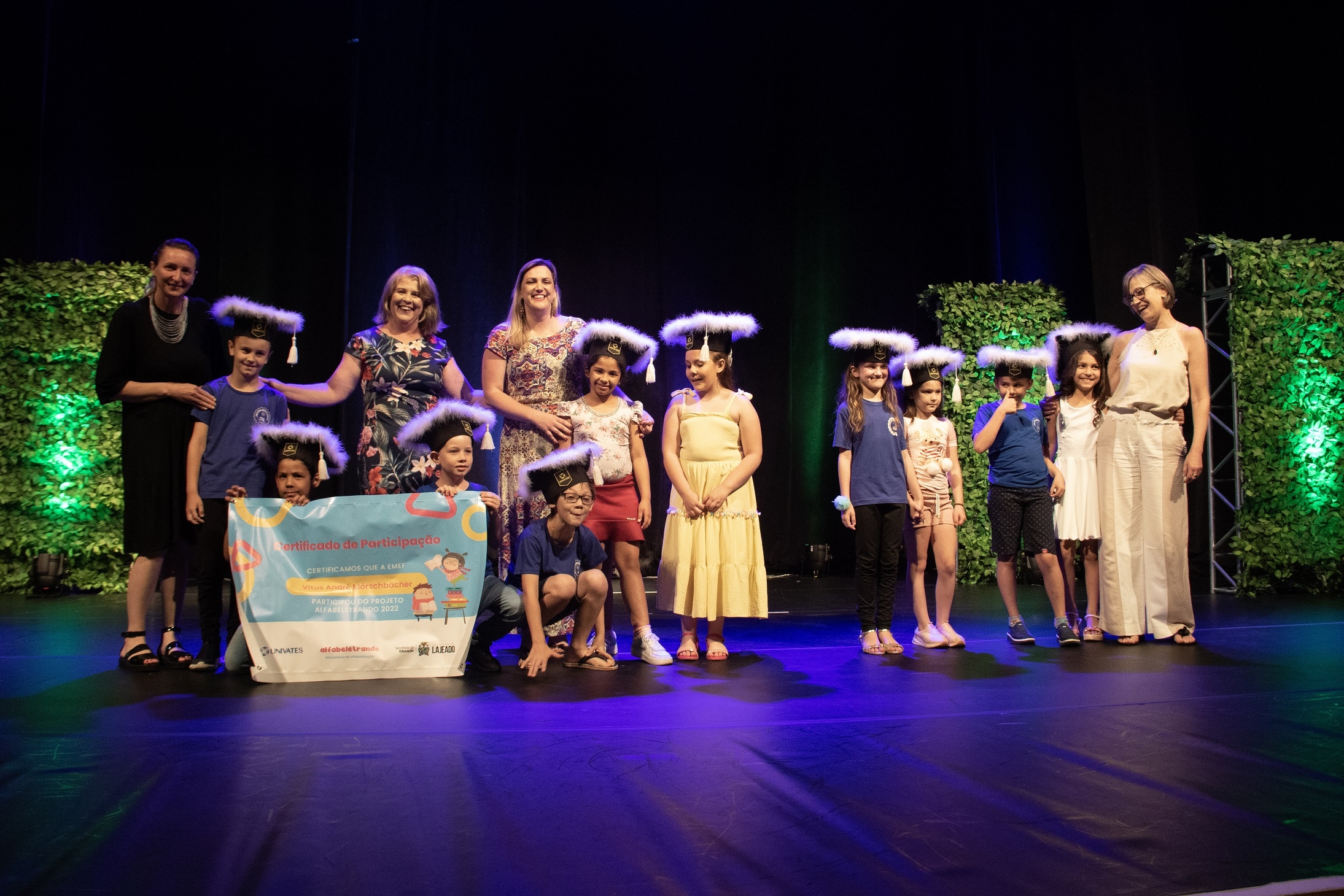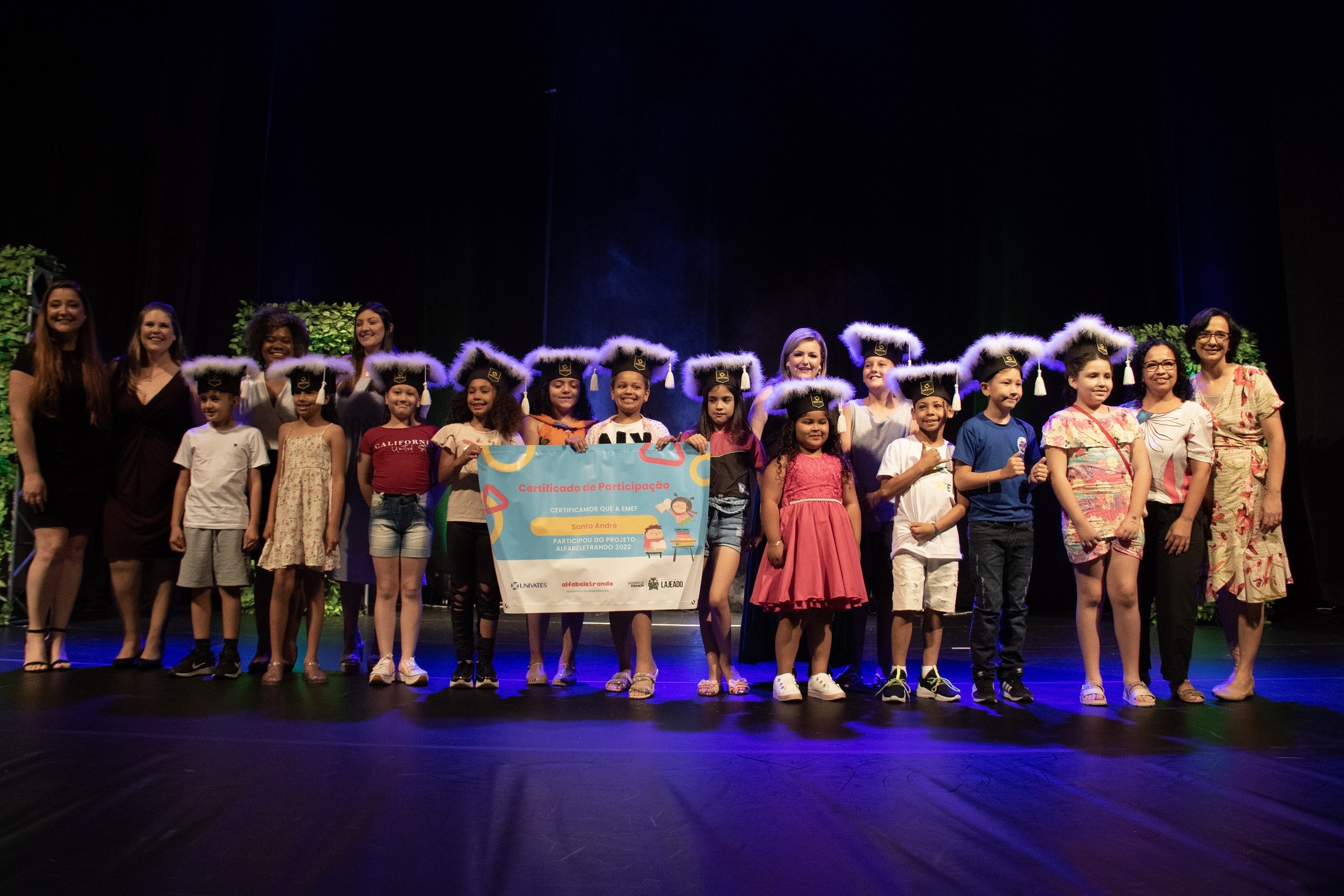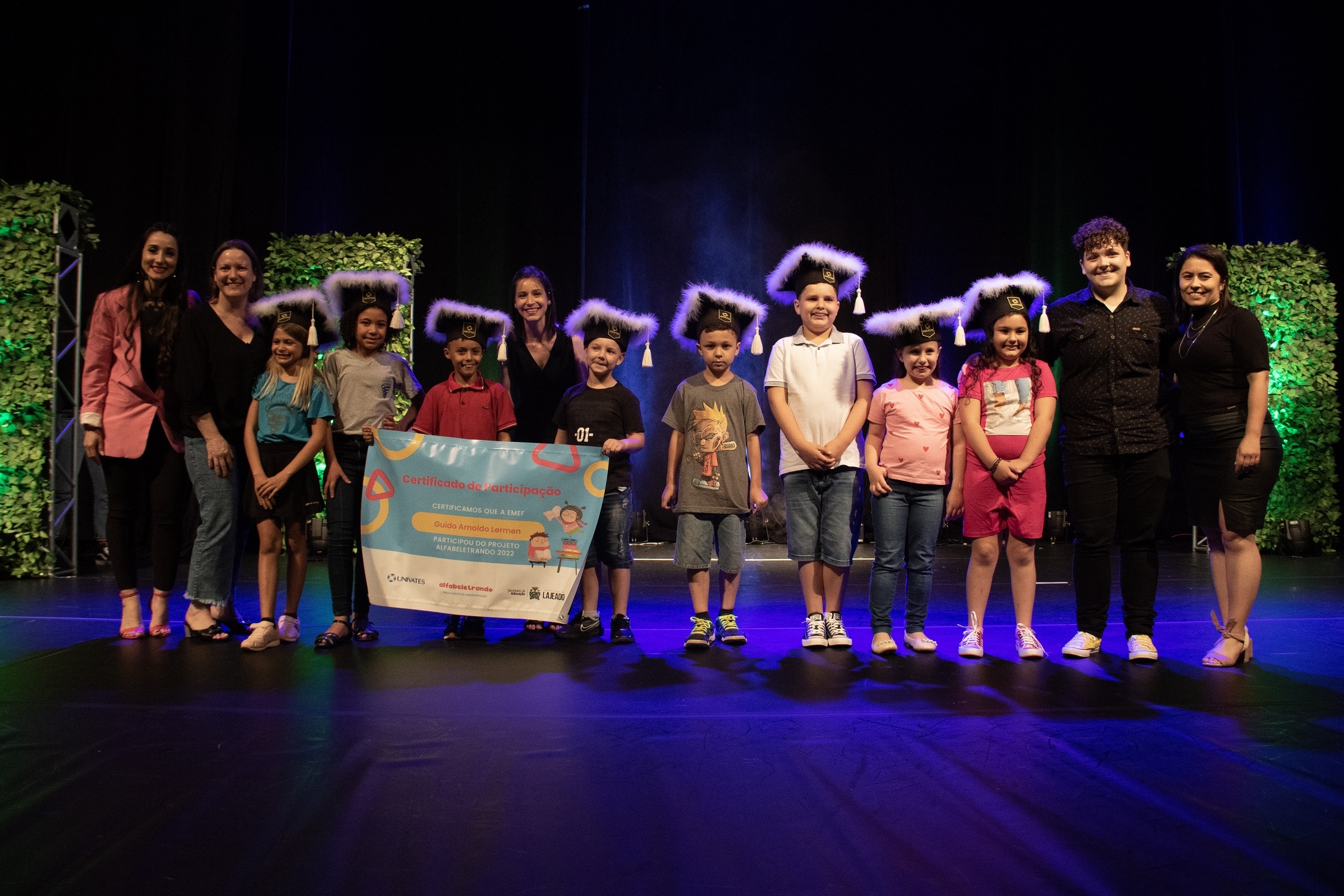 Cerca de mil pessoas participaram da cerimônia de encerramento da primeira edição do projeto Laboratório de Alfabetização – Alfabeletrando, desenvolvido pela Universidade do Vale do Taquari - Univates em parceria com a Prefeitura de Lajeado. O evento foi realizado na noite de quinta-feira, 24, no Teatro Univates, e contou com a presença de aproximadamente 500 crianças que participaram da iniciativa, além de familiares, professores e autoridades.