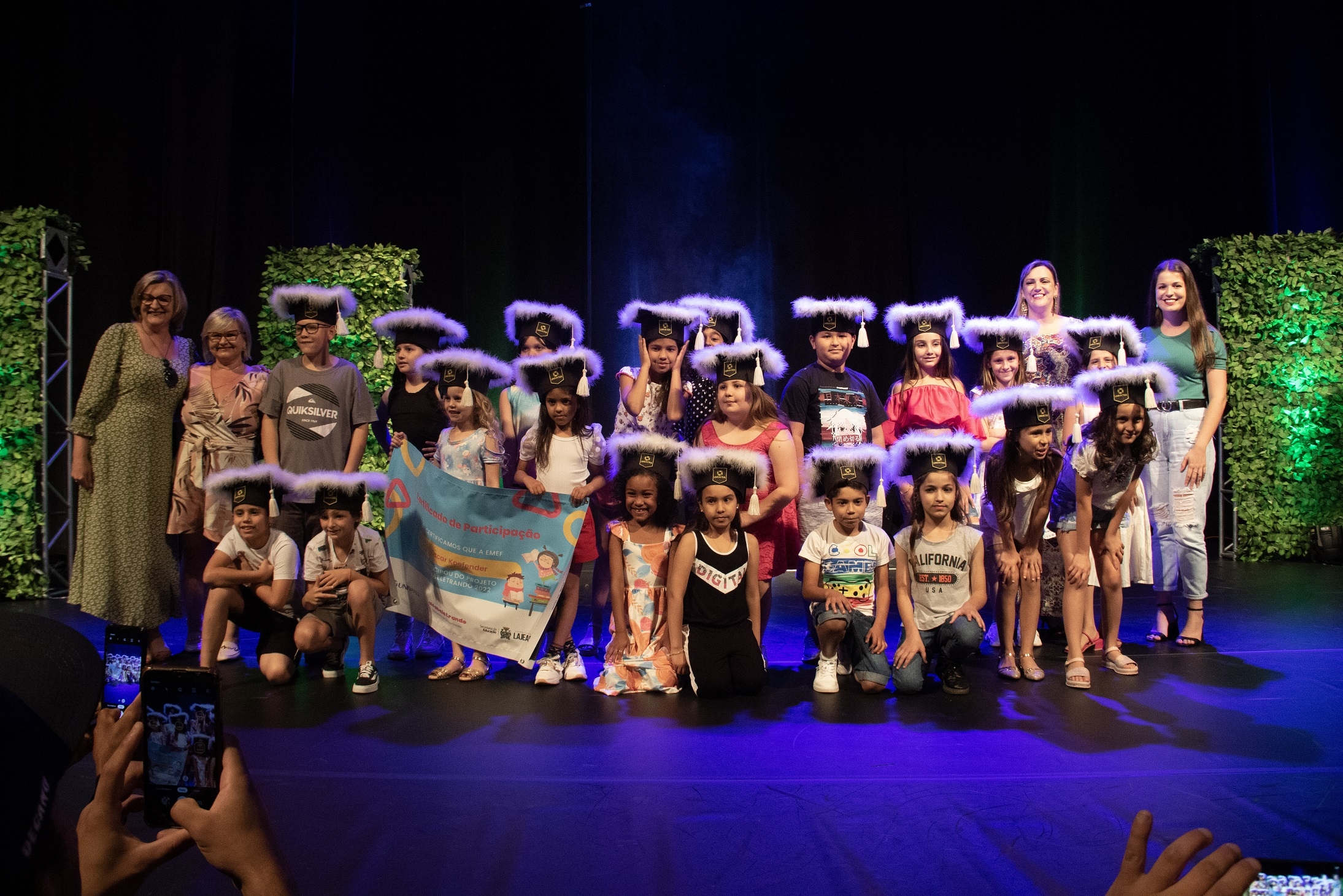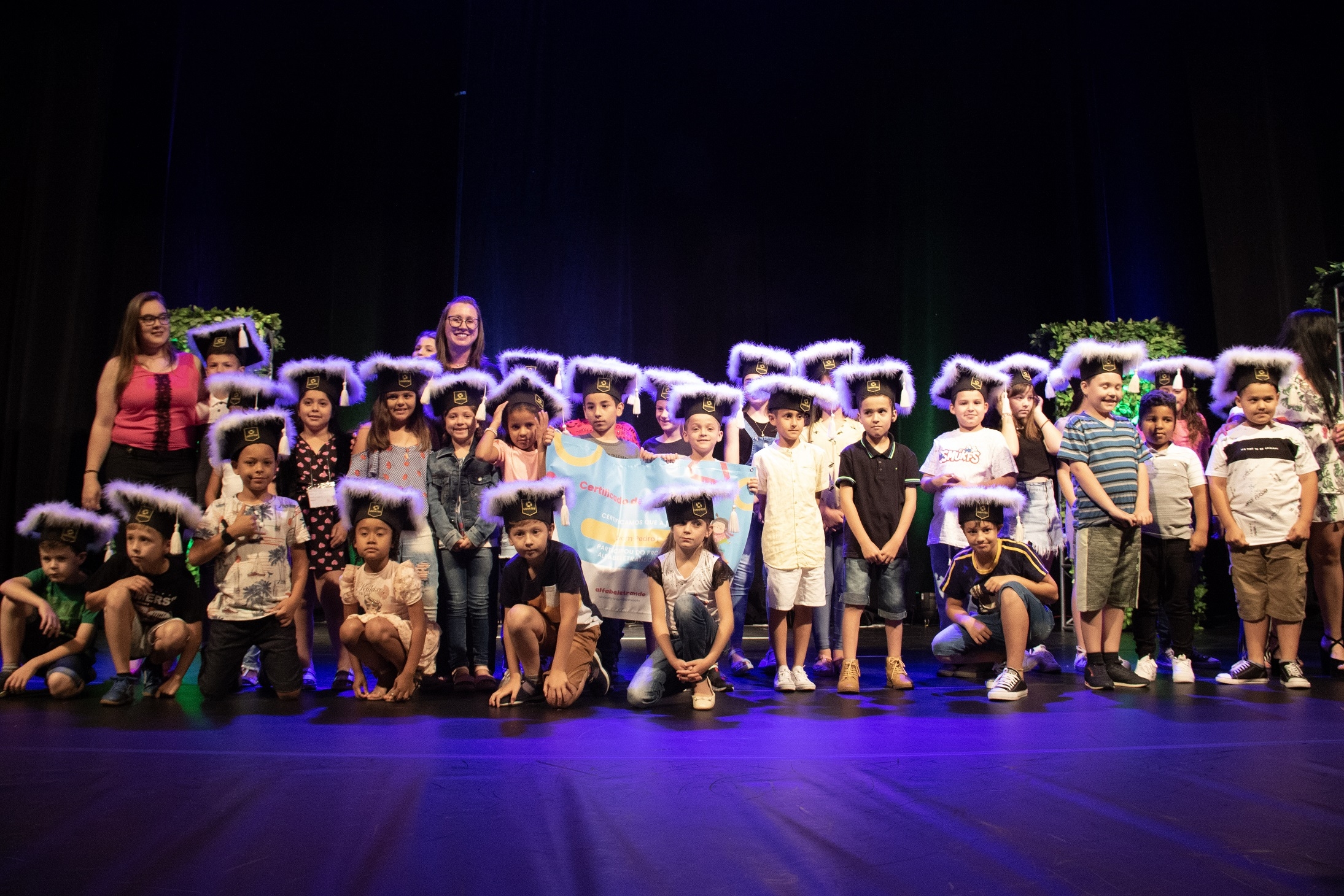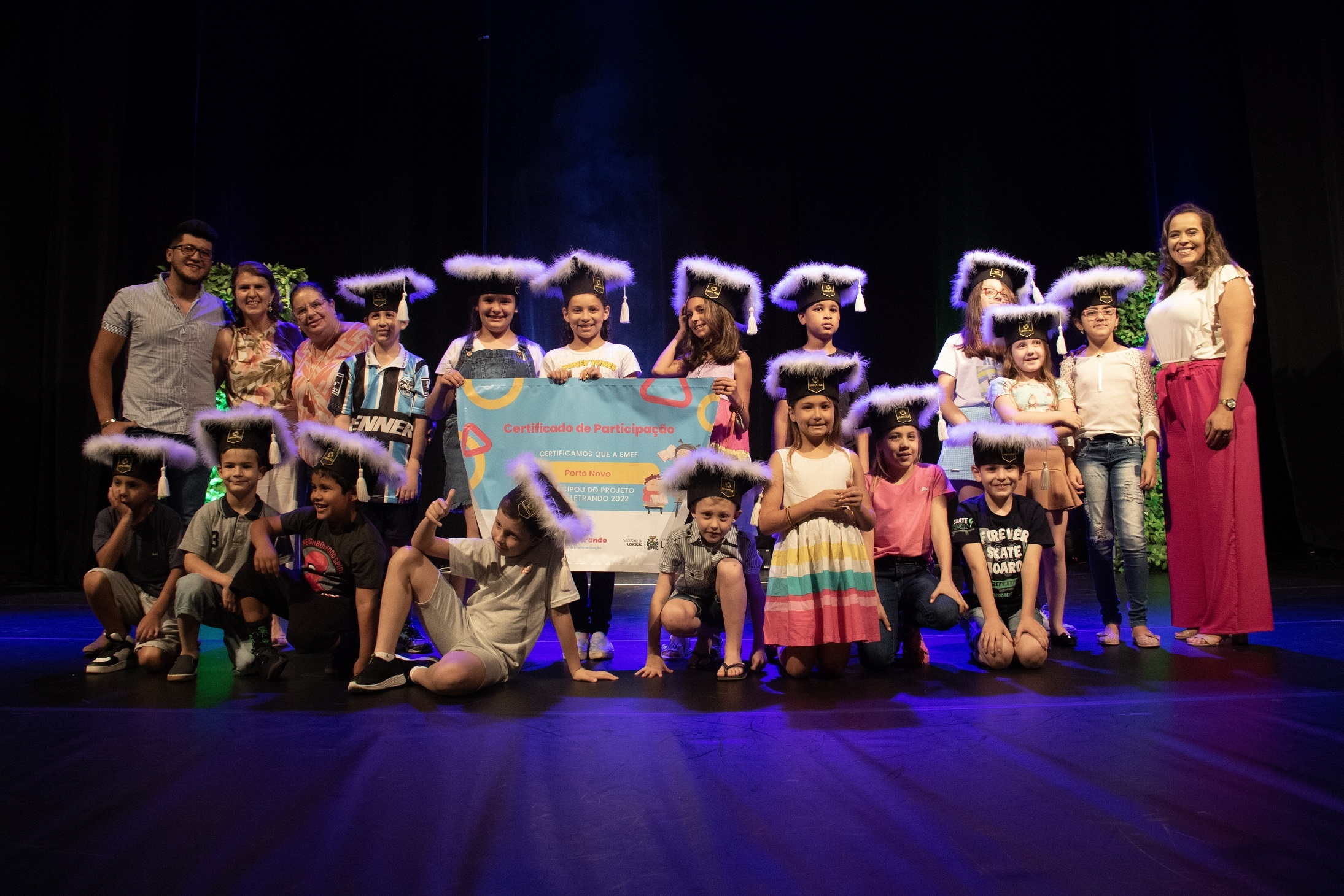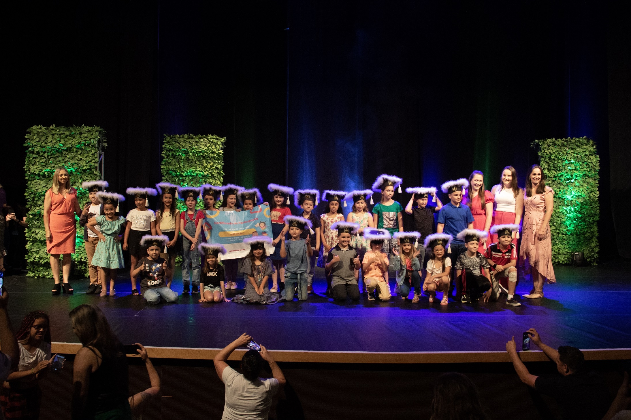 A cerimônia marcou a formatura simbólica dos alunos, que foram chamados ao palco conforme as escolas em que estudam. Cada um recebeu um capelo ? o tradicional nas formaturas de Ensino Superior ? e posou para fotos.