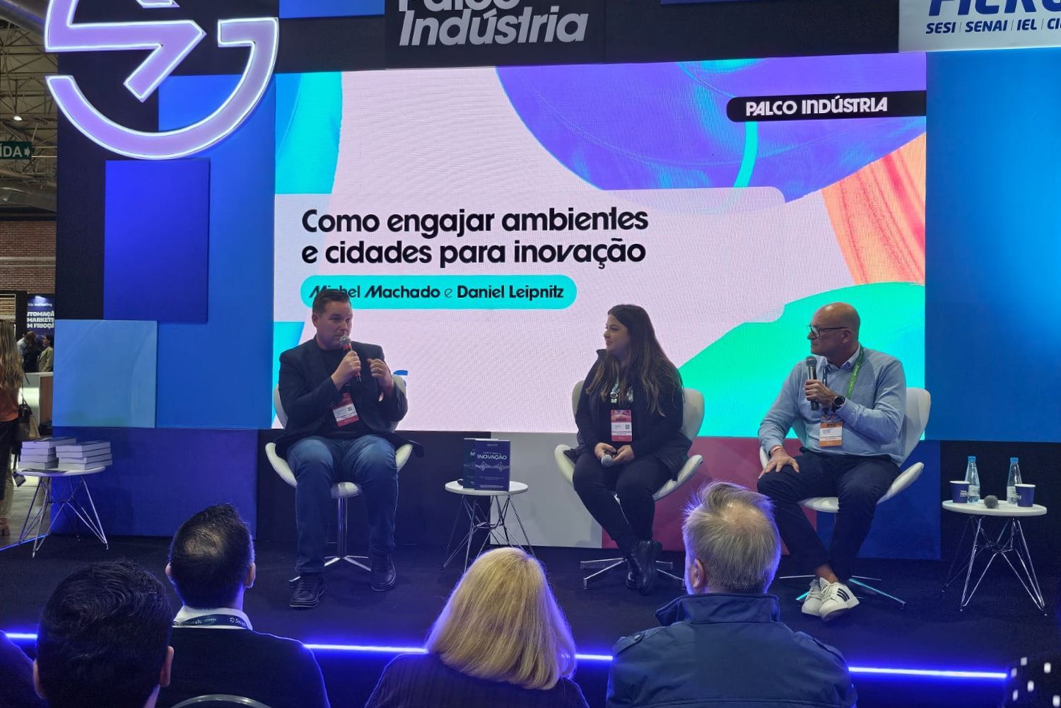 Já no dia 5, Michel Machado participou do painel “Como engajar ambientes e cidades para inovação”, promovido no palco Indústria da Fiergs. Ao lado do empresário e especialista em ecossistemas de inovação Daniel Leipnitz, ele abordou as oportunidades que surgem a partir da aproximação entre indústria e ambientes de inovação.
