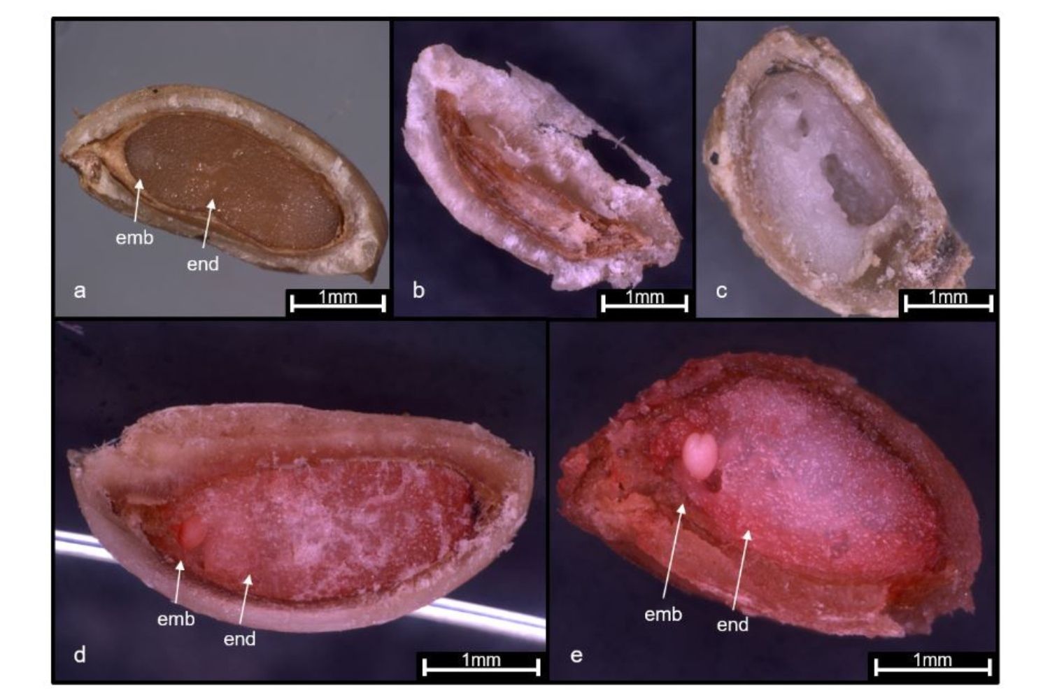 Figura 2 - Sementes cortadas longitudinalmente. (a) Semente intacta com embrião (emb) e endosperma (extremidade). (b-c) Sementes não intactas. (d) Semente viável com embrião (emb) e endosperma (extremidade) dentro do padrão de coloração e firmeza. (e) Semente não viável com embrião (emb) e endosperma (extremidade) fora do padrão de coloração e firmeza
