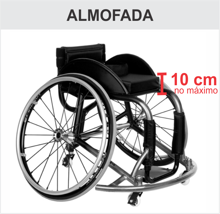 É PERMITIDA SOMENTE UMA ALMOFADA NO ACENTO DA CADEIRA DE RODAS, DEVENDO TER AS MESMAS DIMENSÕES DO ACENTO DA CADEIRA. A ALMOFADA NÃO PODERÁ TER MAIS QUE 10CM DE ESPESSURA. |