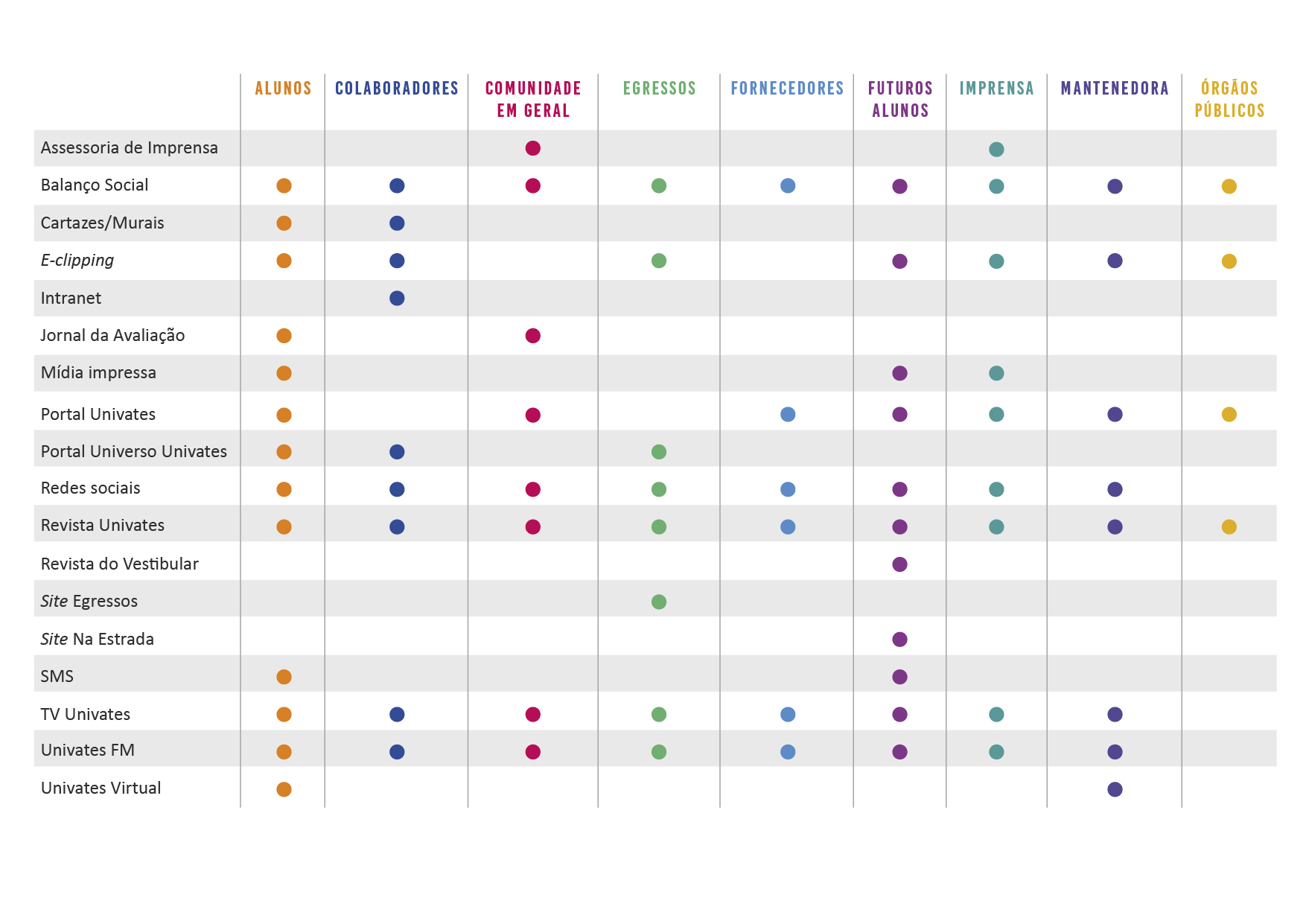 Ainda, os cursos e diversos setores da Univates mantêm páginas próprias nas redes sociais, objetivando ter um canal direto de comunicação com os seus públicos.
