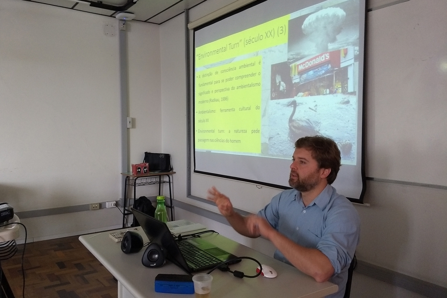 O diplomado no curso de História e mestre pelo PPGAD Eduardo Relly participou como convidado da disciplina Natureza do Conhecimento Ambiental desse Programa no dia 05 de maio. Atualmente Eduardo cursa doutorado na Alemanha e afirma: “(...) a Instituição me preparou muito bem para os desafios que enfrentei e enfrento na Alemanha, principalmente no que diz respeito à convicção que tenho em relação à diluição das fronteiras científicas. A Instituição foi meu berço acadêmico”.