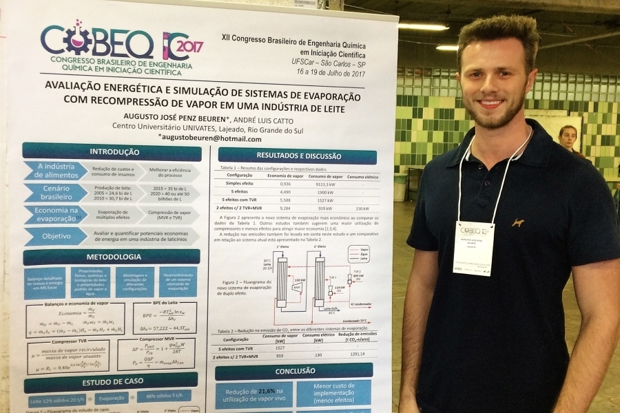 A partir do trabalho realizado no final do curso, Augusto Beuren, diplomado em Engenharia Química pela Univates, buscou minimizar a demanda energética em processos industriais visando à diminuição dos custos de operação. A pesquisa foi selecionada para ser apresentada no maior congresso brasileiro de engenharia química e foi submetida à revista Energy. Beuren, que iniciou o curso em 2012, destaca a importância de participar de seminários e congressos e ter boas notas durante a graduação para o crescimento e a atualização profissional.