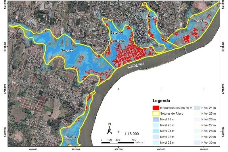 “Foram mapeadas as áreas atingidas pelas inundações do nível de 19 m até o nível de 30 m. No nível topográfico de 19 m, a área total abrangida pela inundação foi de 25,98 ha, aumentando para 112,15 ha no nível máximo estudado (30 m), o que representa 11,50% da área total do município”, explicou ela. Conforme o estudo, o número de edificações atingidas pode chegar a 1.039 unidades quando o Rio Taquari atinge 30 m, porém, com uma inundação de magnitude pequena, em que o rio chega a 21 m, já são afetadas 98 edificações. Confira mais dados no infográfico.
