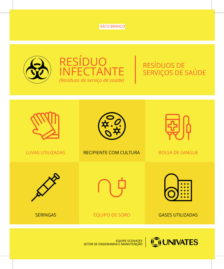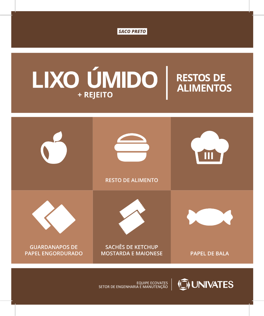 Na Universidade do Vale do Taquari, o Ecovates é a equipe responsável por identificar todos os coletores do campus, que estão designados conforme a geração de resíduos de cada local, de acordo com os adesivos abaixo: