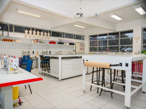 O Laboratório de Design de Moda simula uma confecção industrial, permitindo ao aluno praticar todas as etapas da confecção de uma roupa, desde o processo de modelagem, passando pelo corte, costura e acabamentos. O aluno também utiliza os manequins para técnicas de modelagem, como a Moulage.