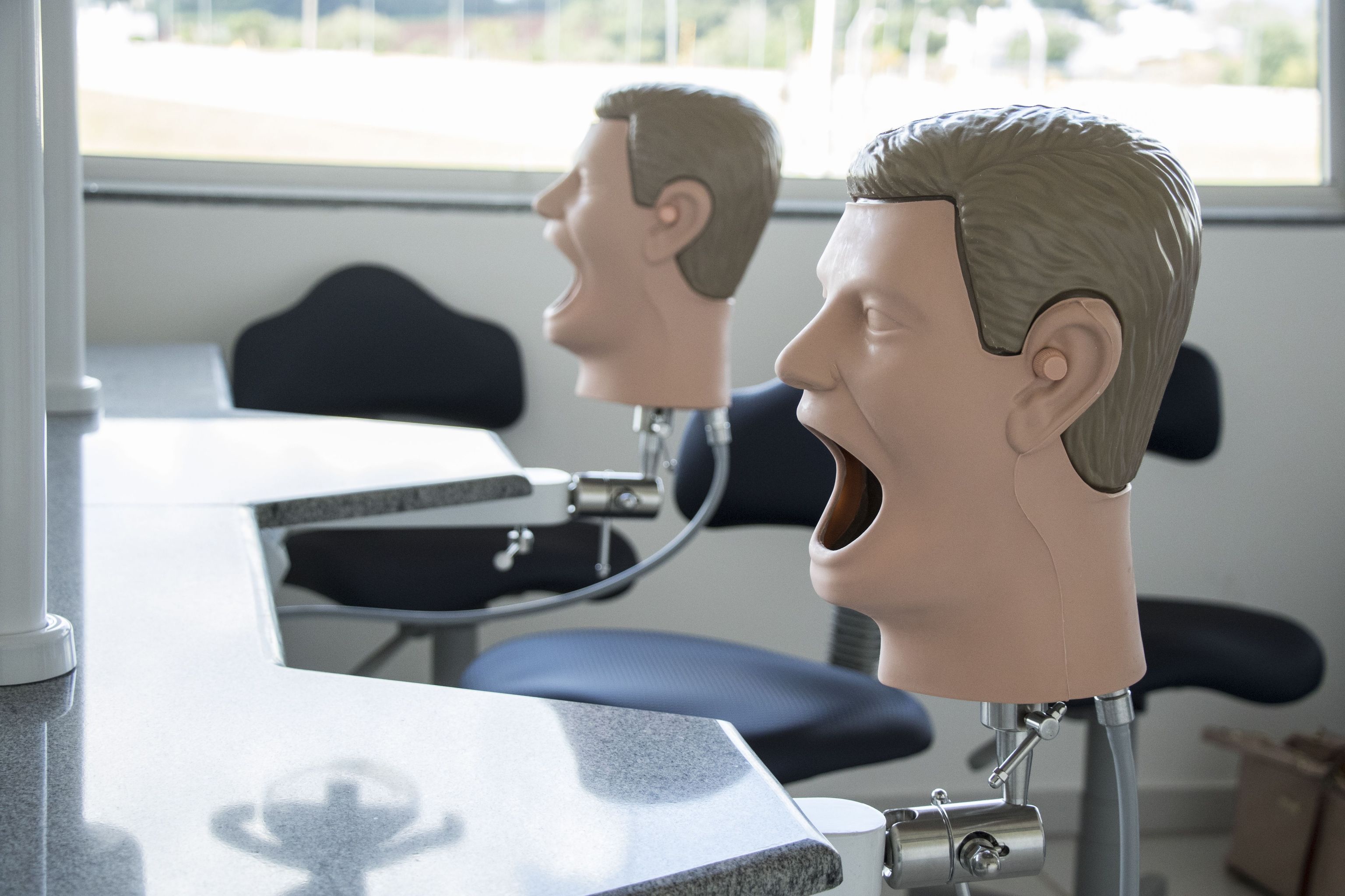 - Principais recursos: Manequins dispostos em fileiras, instalados em bancadas de mármore; Unidades auxiliares acopladas às estações de trabalho; Refletores odontológicos individuais por estação; Mochos odontológicos distribuídos ao longo das bancadas; Pias destinadas à higienização das mãos; Televisores de 50 polegadas para transmissão de imagens e vídeos; Computador para apoio às atividades acadêmicas; Armário destinado ao armazenamento de materiais de consumo.