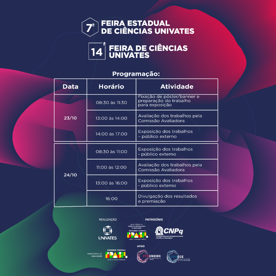 Nos dias 23 e 24 de outubro, a Univates sedia palco para a 7ª Feira Estadual de Ciências Univates e da 14ª Feira de Ciências Univates: descobrindo talentos para a pesquisa. A feira irá ocorrer na modalidade presencial, na Arena do Complexo Esportivo da Univates.