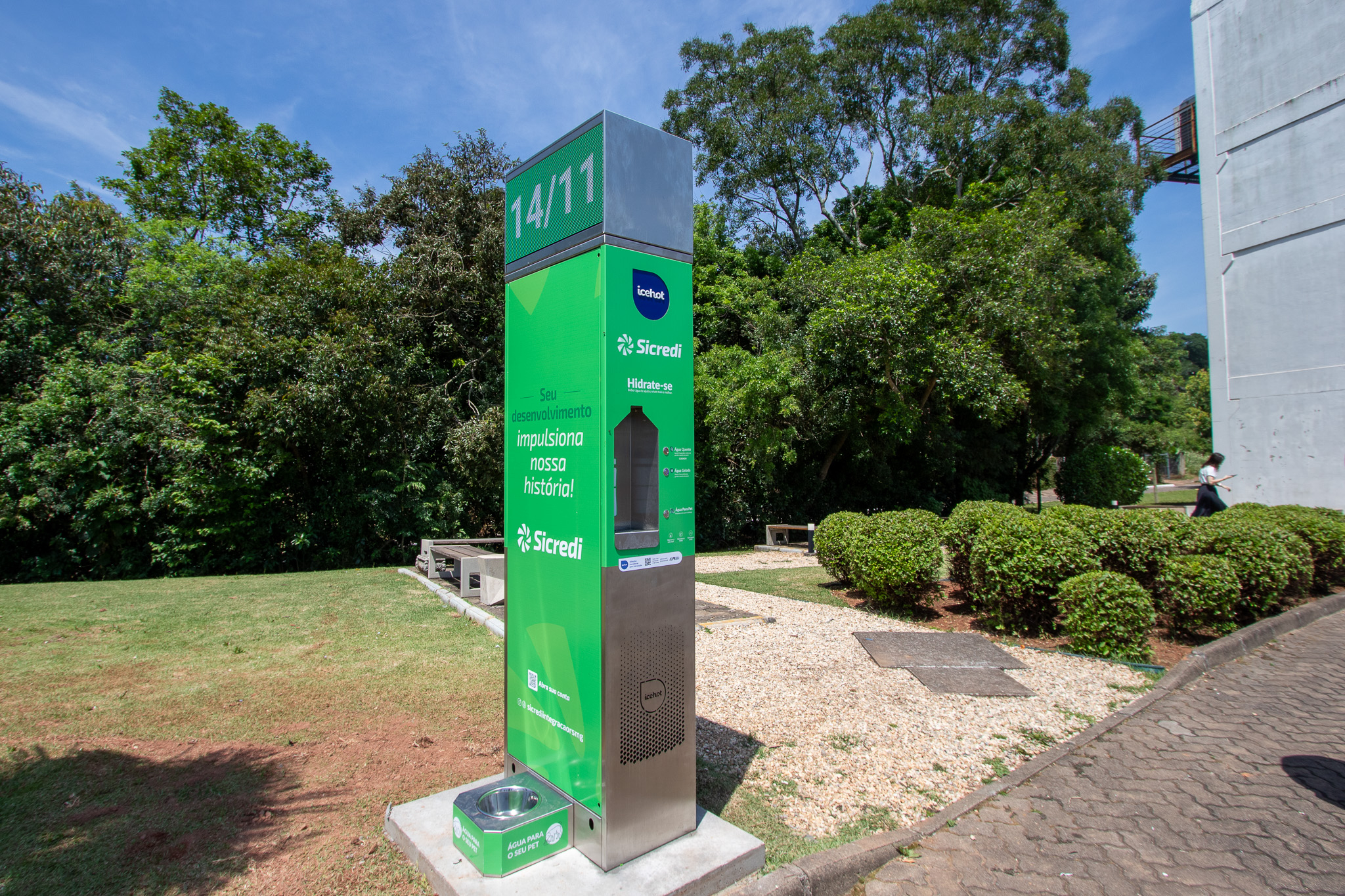 O totem, com estrutura em aço inox, conta com água quente e água gelada, além de dispenser de água para pets, com acionamento por botões e pedal. O equipamento é de uso gratuito para toda a comunidade e também dispõe de painel digital que mostra data e hora.