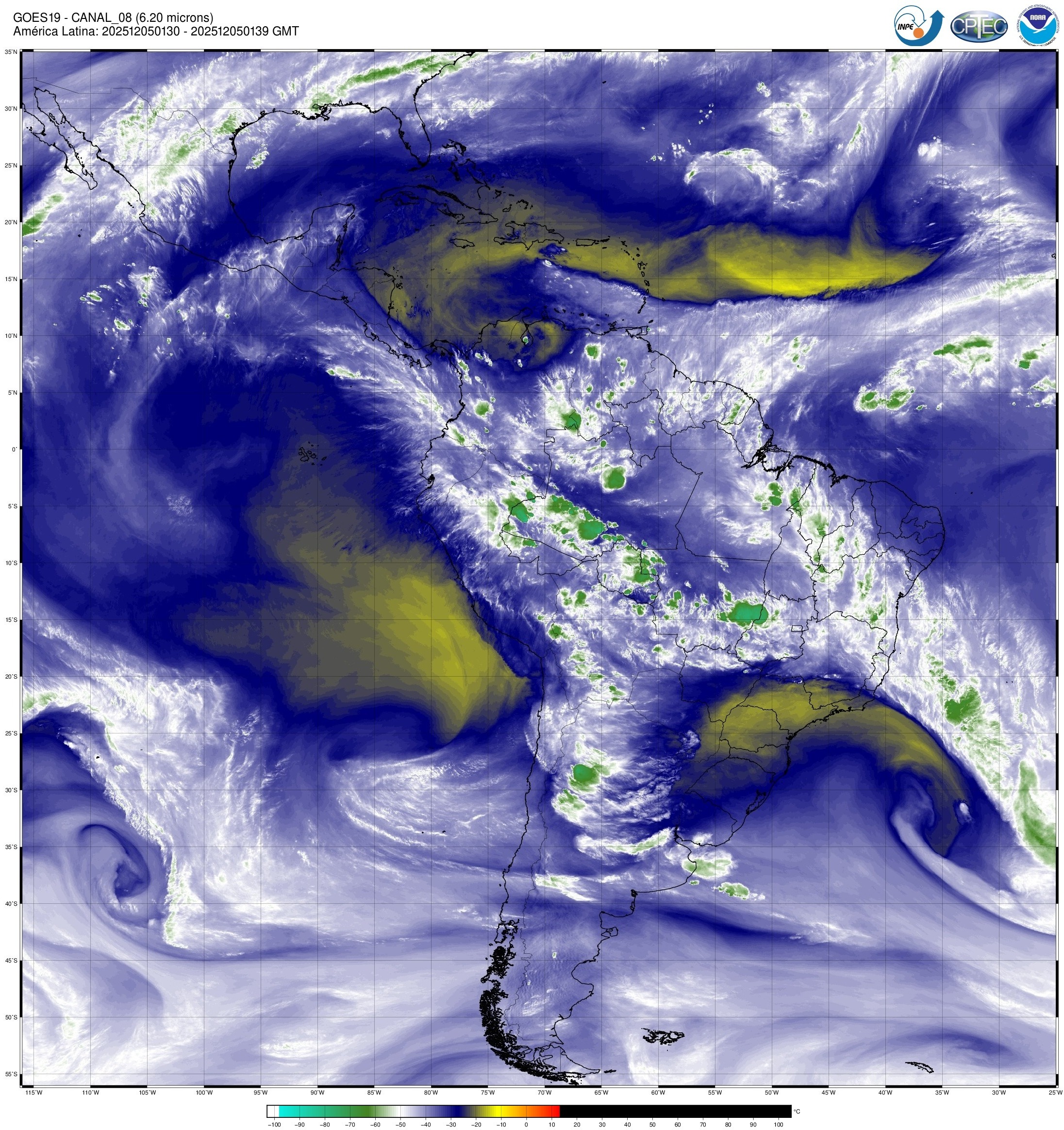 Goes 16 canal 8 (wv) - Esse produto utiliza a banda 8 do imageador ABI do GOES-16 para identificar a distribuição de vapor dágua em médios e altos níveis na atmosfera.