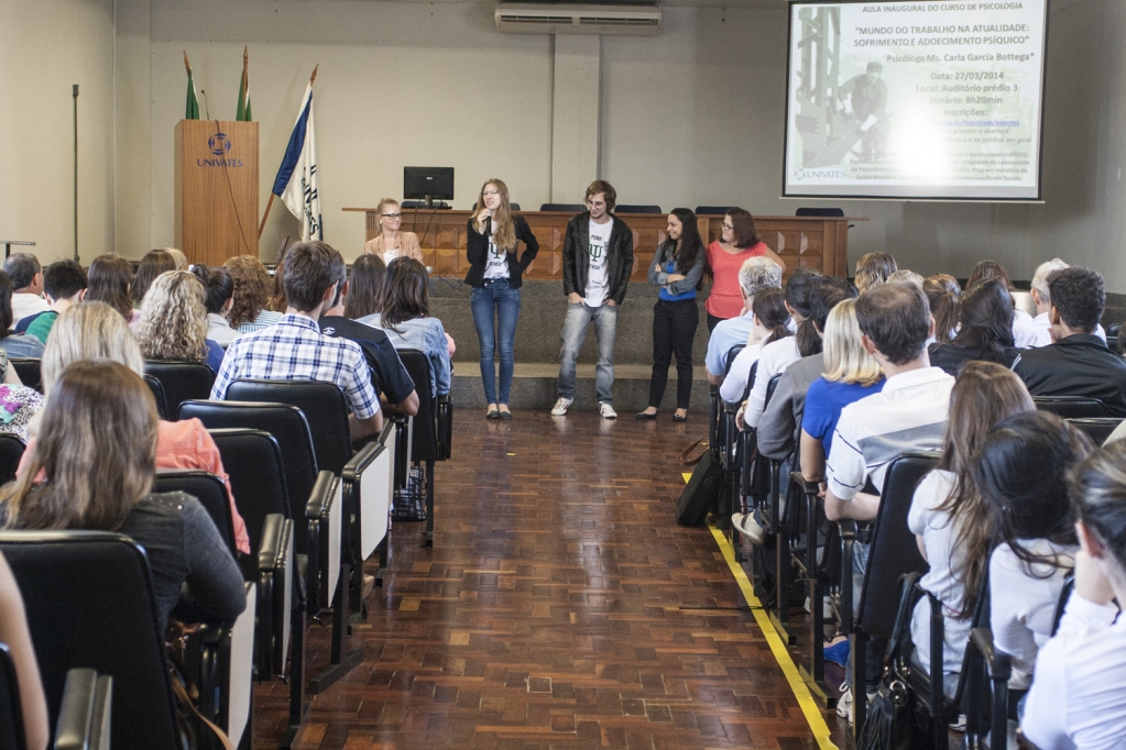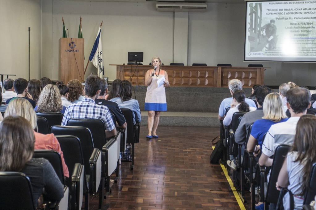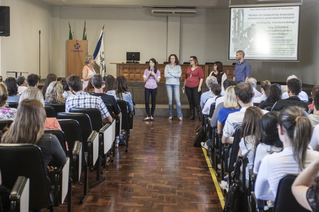 O curso de Psicologia da Univates realizou, na manhã desta quinta-feira, dia 27, a aula inaugural deste semestre. A atividade contou com apresentação da coordenadora do curso, professora Ana Lúcia Bender Pereira, dos integrantes do Diretório Acadêmico de Psicologia e de alguns docentes do curso que estavam presentes no evento. Após, foi realizada a palestra ?Mundo do Trabalho na Atualidade ? sofrimento e adoecimento psíquico?, ministrada pela psicóloga e doutoranda Carla Garcia Bottega.