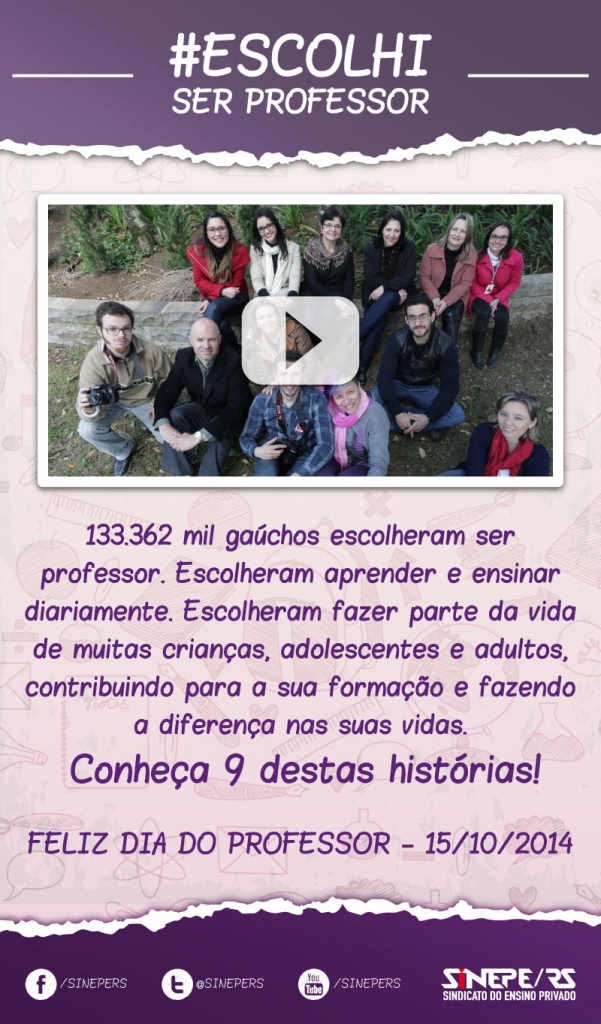 O Sindicato do Ensino Privado do Rio Grande do Sul (SINEPE/RS) deu início às homenagens pelo Dia do Professor nesta segunda-feira, dia 13 de outubro, com o lançamento de um vídeo que conta a história de nove professores de instituições de ensino privadas de diferentes regiões do Estado. O material foi lançado no canal do Youtube - http://youtu.be/ywX5IgfxXoA e também pode ser conferido no Facebook do SINEPE/RS - https://www.facebook.com/sinepers e no portal da entidade ? www.sinepe-rs.org.br.