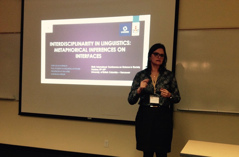 A professora Kári Forneck, que leciona nos cursos do Centro de Ciências Humanas e Sociais da Univates, participou, entre os dias 10 e 11 de outubro, da International Conference on Science in Society, ocorrida em Vancouver, no Canadá. O evento foi realizado na University of British Columbia e teve como tema central ?As identidades da Ciência?.