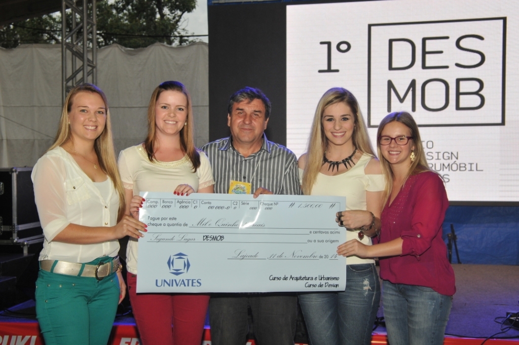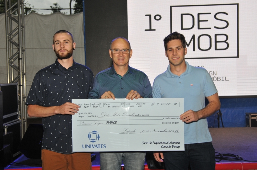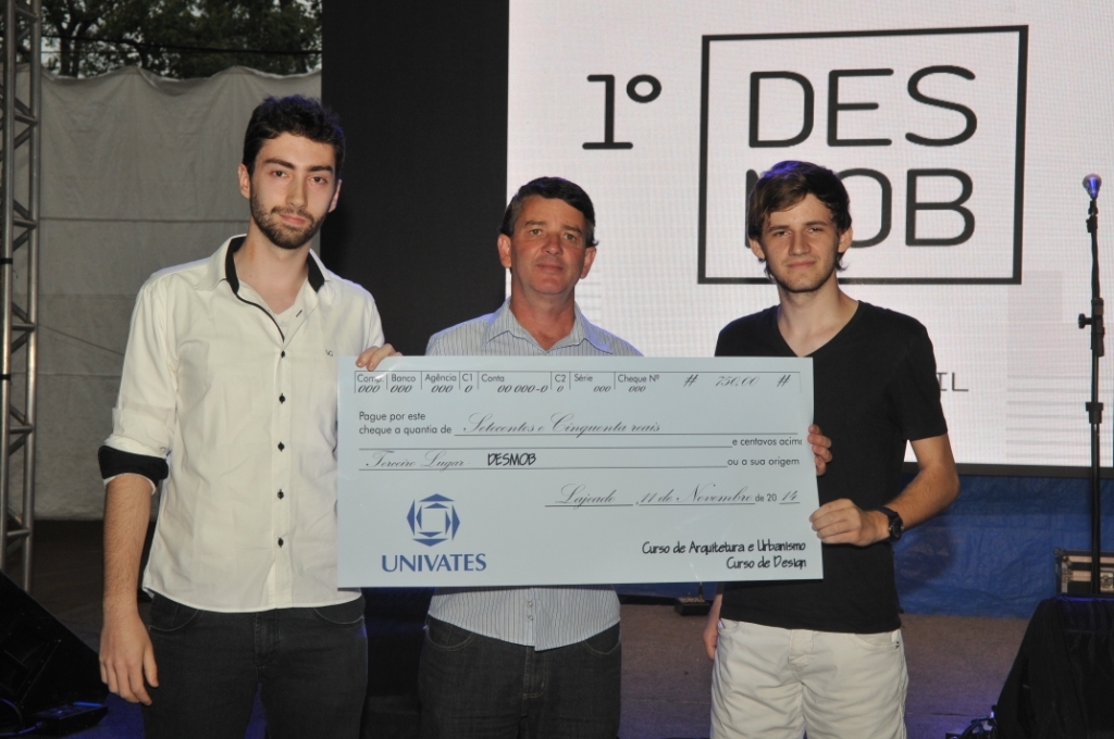 Os três grupos de acadêmicos ganhadores do 1º Prêmio de Design Construmóbil Univates (Desmob) receberam premiação nesta terça-feira à noite, dia 11. A cerimônia ocorreu na Praça de Alimentação da 19ª Expovale e marcou a entrega dos cheques de R$ 2.500,00, R$ 1.500,00 e R$ 750,00, respectivamente para o primeiro, segundo e terceiro lugares.