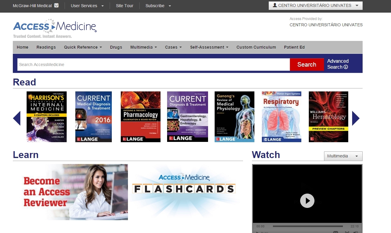 Na AcessMedicine, edições podem ser conferidas em primeira mão, além de imagens, vídeos, animações, estudos de caso, conteúdo online exclusivo, atualizações de capítulos e testes diagnóstivos. Entre os títulos, é possível encontrar Harrison's?, CURRENT Medical Diagnosis & Treatment, Tintinalli?s Emergency Medicine, Hurst?s The Heart e Goodman & Gilman?s.