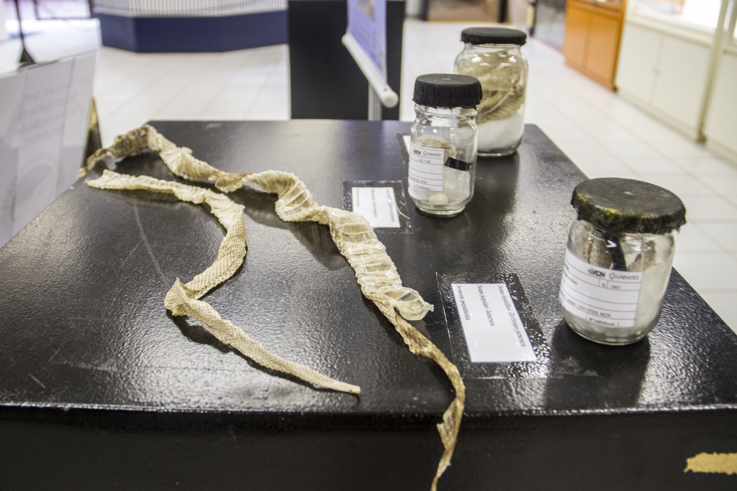 Com o objetivo de informar, caracterizar e desmitificar temas relacionados a esses répteis, a exposição conta com um acervo utilizado em salas de aula e cursos de extensão. “O mundo rastejante das serpentes” aborda informações e materiais visuais. Além disso, traz animais que são alimentos de serpentes e animais que, muitas vezes, são confundidos com elas, como é o caso do muçum.