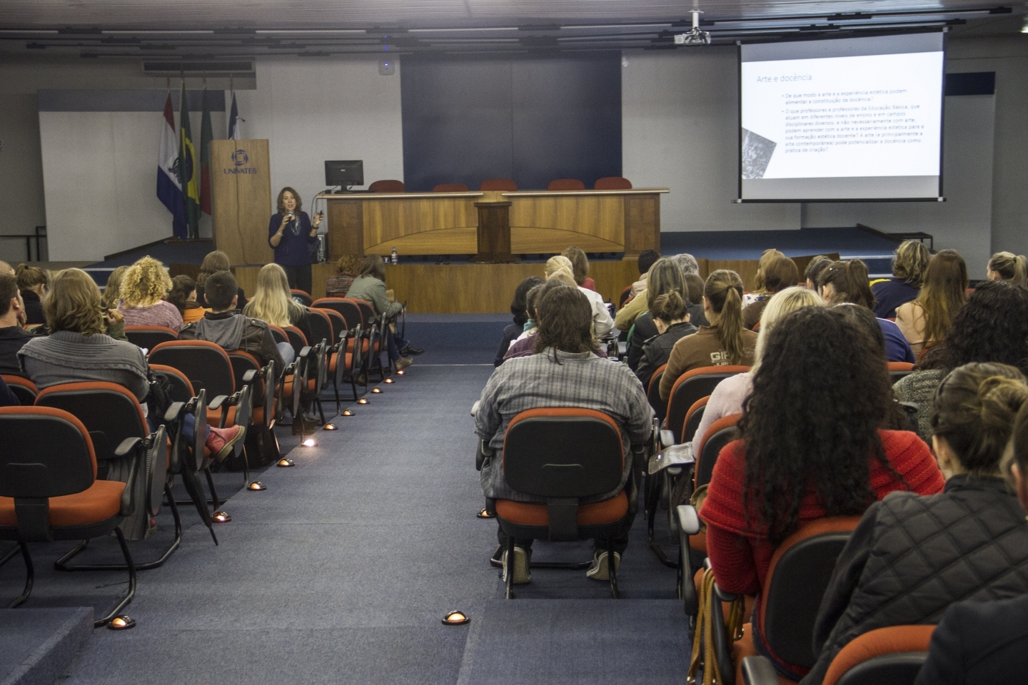 O projeto Transvisões deu início às suas atividades na noite da última terça-feira, dia 26. Com a palestra ?Arte e estética: desafios contemporâneos para a docência?, a professora do Programa de Pós-Graduação em Educação da Universidade Federal do Rio Grande do Sul (Ufrgs) e pesquisadora na área de arte e docência, doutora Luciana Loponte, capturou os olhares de estudantes e professores. O projeto Transvisões é uma atividade do grupo de pesquisa Currículo, Espaço, Movimento (CEM), financiado pelo Conselho Nacional de Desenvolvimento Científico e Tecnológico (CNPq) e vinculado ao Mestrado em Ensino da Univates.