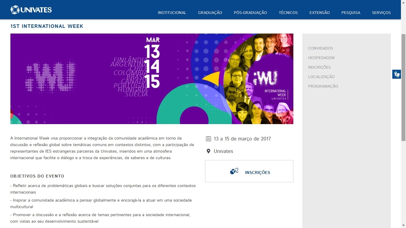 A Univates realiza um evento pioneiro no mês de março. A Instituição debaterá, nos dias 13, 14 e 15, temas globais com palestrantes renomados do Brasil e do exterior. A atividade faz parte da International Week, que tem como objetivo proporcionar a integração da comunidade acadêmica em torno da discussão e reflexão global sobre temáticas comuns em contextos distintos. Com a participação de representantes de instituições de ensino superior estrangeiras parceiras da Univates, os temas debatidos estão inseridos em uma atmosfera internacional que facilita o diálogo e a troca de experiências, de saberes e de culturas. O evento acontece nos turnos da manhã, tarde e da noite.