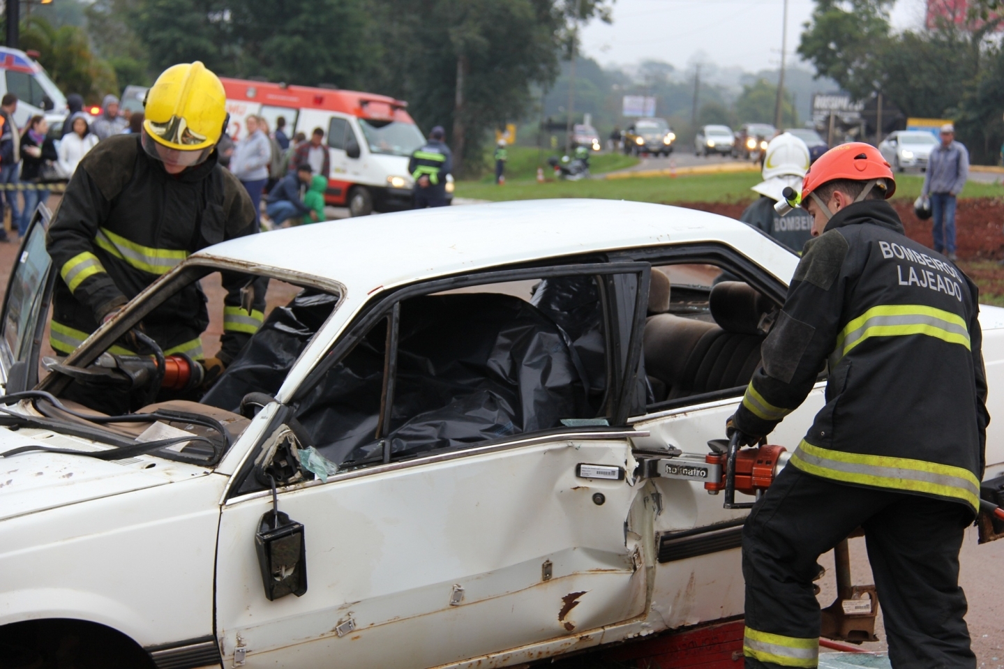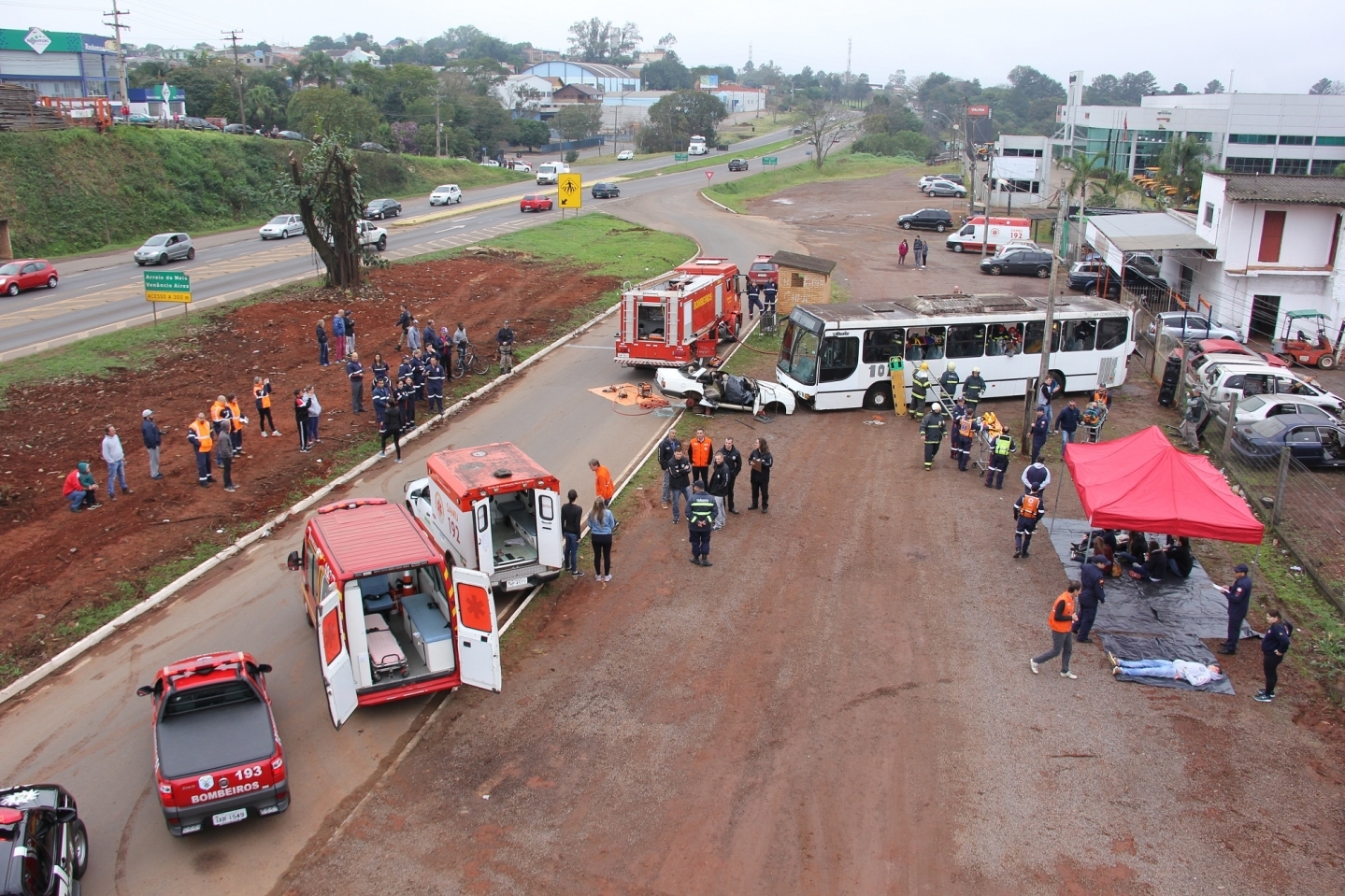 Alunos do curo de Medicina da Univates e da Liga de Urgência e Emergência do Trauma (Lauet) participaram de um exercício simulado de acidente de trânsito com 33 feridos, junto ao trevo de acesso ao Bairro Montanha, na Rua Donga Menezes, ao lado da BR 386, na altura do km 344 da rodovia, realizado pelo Município de Lajeado realizou, no sábado, 1º. Membros do Corpo de Bombeiros de Lajeado, da Polícia Rodoviária Federal (PRF), Secretaria de Segurança Pública de Lajeado (Sesp), agentes municipais de trânsito, da Secretaria de Saúde (Sesa), EGR, Hospital Bruno Born, Hospital Estrela, UPA de Lajeado, Polícia Civil, Brigada Militar, Corpo de Bombeiros Voluntários de Teutônia, alunos do Curso de Medicina da Univates, Lauet, ambulância de Santa Clara do Sul, Defesa Civil estadual e municipal, bem como resgatistas do SAMU, União Assistencial e SOS Unimed, participaram do evento que ocorreu das 8h às 11h. A situação envolvia uma colisão frontal de um carro com três passageiros, sendo duas vítimas fatais e uma em estado crítico, com um ônibus com outras 30 vítimas, algumas em estado de choque e alteradas clamando por atendimento dos resgatistas. Bombeiros utilizaram, inclusive, desencarceradores para simular vítimas entre as ferragens. Escadas foram utilizadas para retirada de vítimas pelas janelas do ônibus. Hospitais e UPA simularam o recebimento dos feridos, enquanto ambulâncias foram utilizadas para o transporte. Paralelamente, agentes de trânsito e da PRF orientavam os motoristas nas vias municipais adjacentes e na rodovia federal. Não ocorreu paralisação da BR 386.