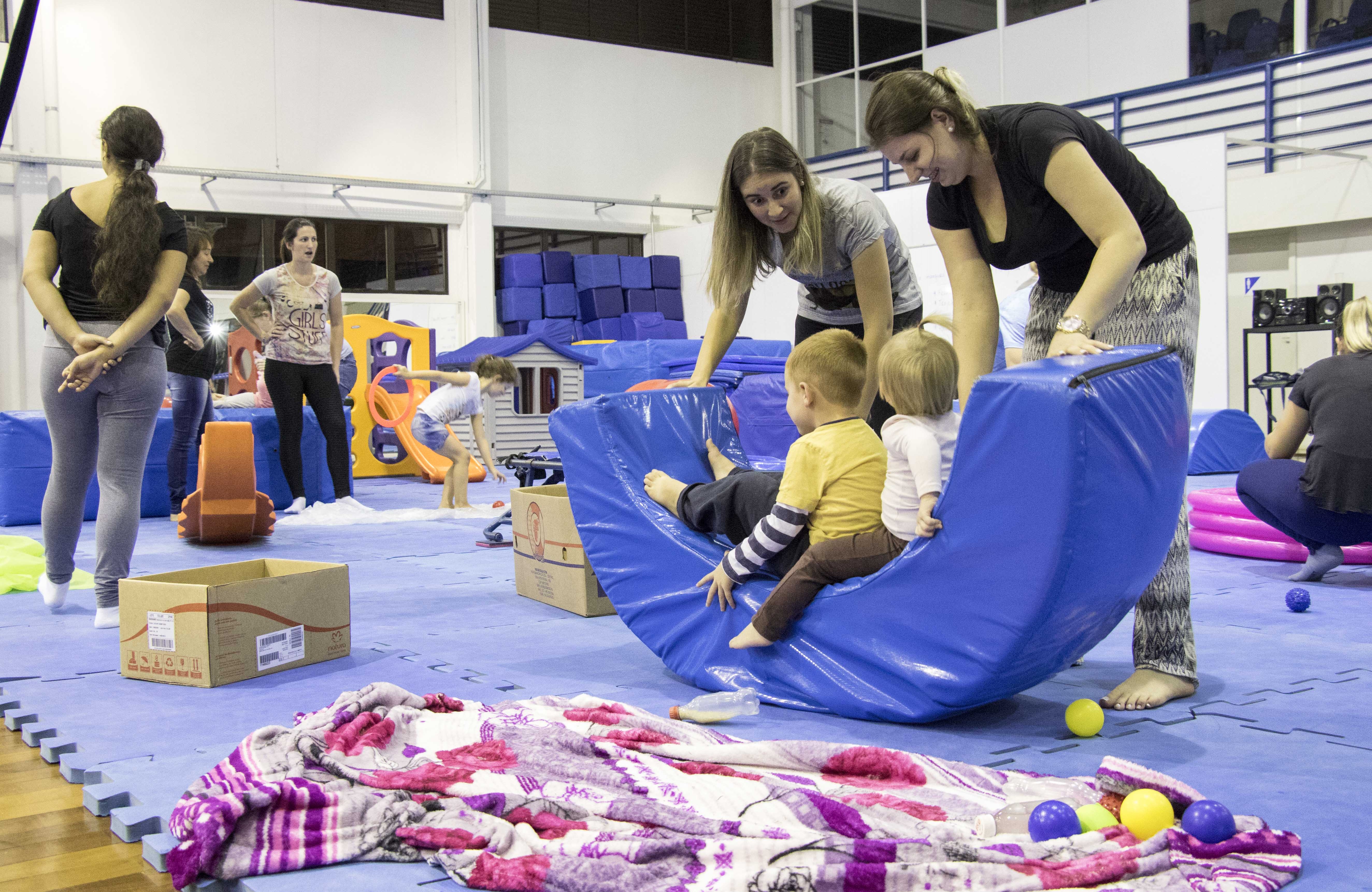 A turma da disciplina Saberes e Práticas da Corporeidade II, do curso de Pedagogia da Univates, realizou nesta quinta-feira, 22, uma atividade voltada a bebês de zero a três anos com o objetivo de criar desafios motores para as crianças e oportunizar que as estudantes conduzissem a prática de experimentação corporal dos bebês.