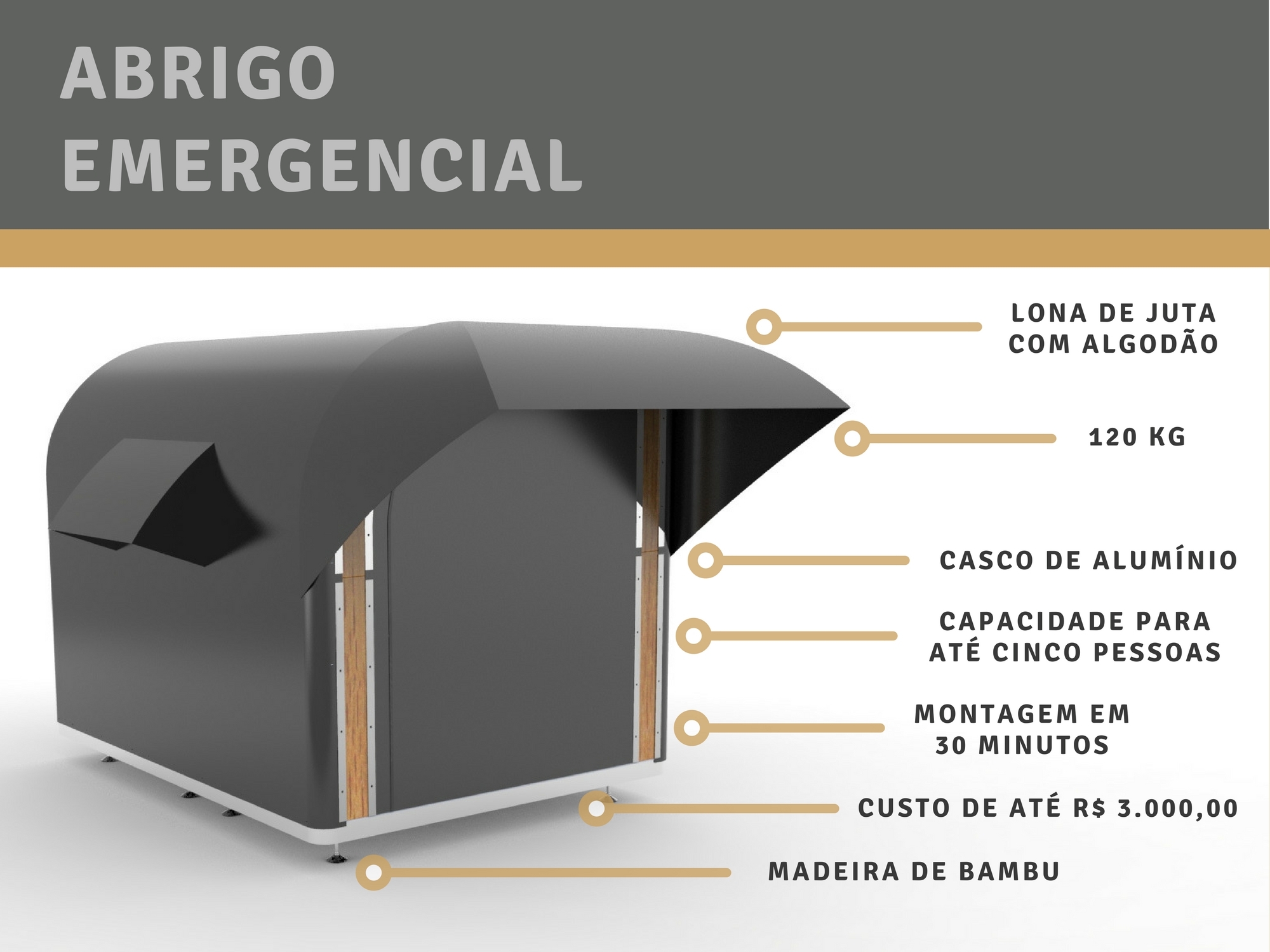 Esses abrigos são usados em situações de emergência como uma forma de manter o mínimo de dignidade, segurança e comodidade aos desalojados Jéssica Rempel, diplomada do curso de Design