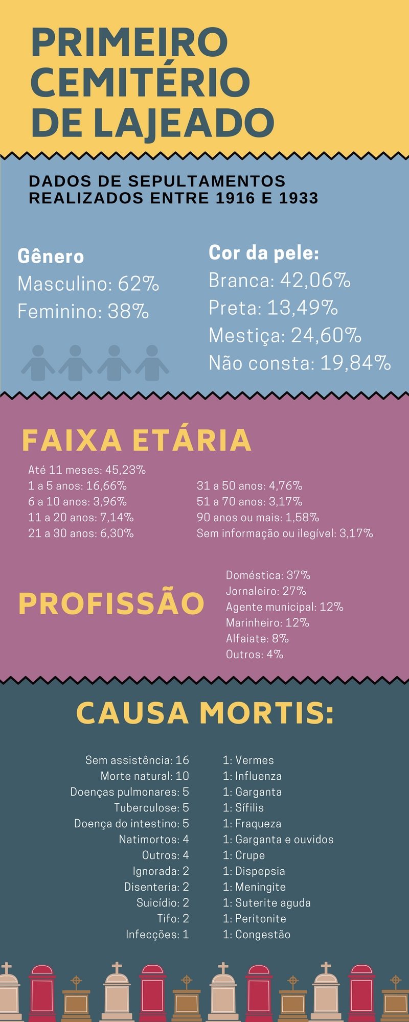 A diplomada acrescenta que quase a metade das mortes registradas foi de bebês de até 11 meses de idade. Em relação ao sexo, a maioria dos óbitos foi registrada em pessoas do sexo masculino. Já em relação à cor da pele, os registros apontam que 42% dos falecidos eram brancos. A principal causa de morte foi falta de assistência, seguida de morte natural, e o ano com maior registro de mortes foi 1917. Confira mais dados no final da matéria.