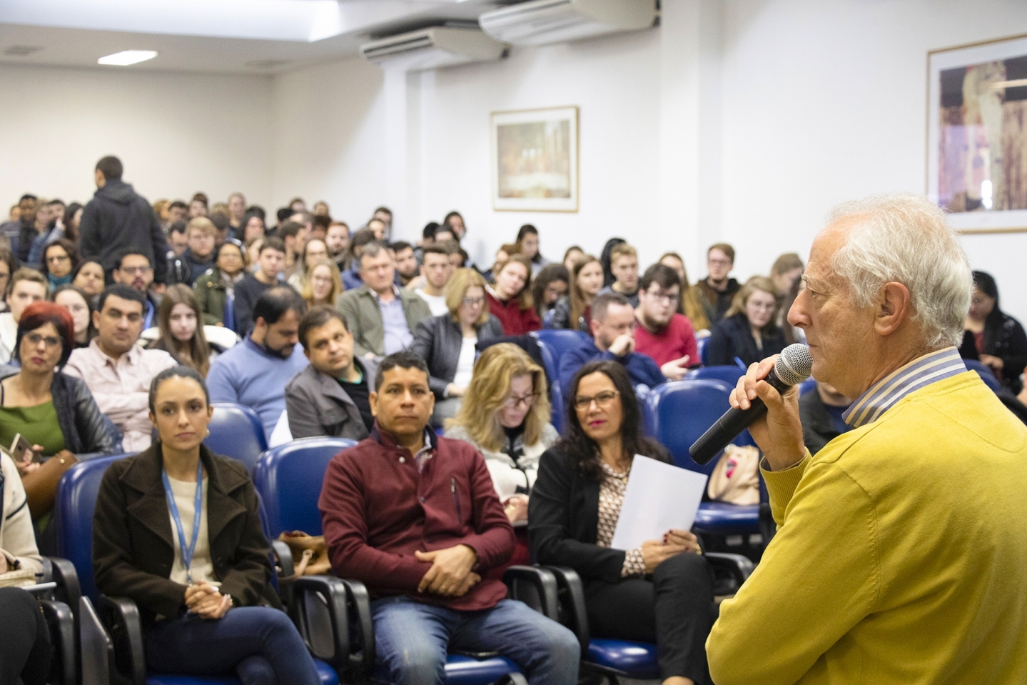 Em sua palestra, Favilli comentou sobre a estrutura do sistema educacional na Itália, explicando as etapas pelas quais os estudantes passam durante a vida. A educação no país é obrigatória até o Ensino Médio, que tem duração de cinco anos, sendo três opcionais, considerados especializantes. O professor ressaltou o fato de a maior parte da educação italiana ser pública, tanto nos Ensinos Fundamental e Médio quanto nas universidades. Em relação às pesquisas, Favilli mencionou que a maior dificuldade da Itália está na questão financeira.