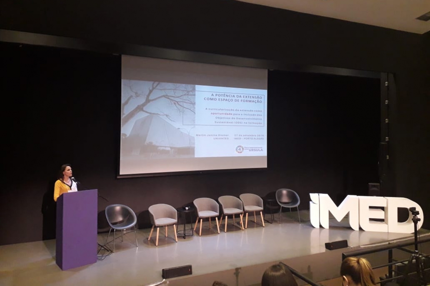 Na última sexta-feira, dia 27 de setembro, a coordenadora pedagógica da Extensão Acadêmica na Univates, professora Merlin Janina Diemer, participou do painel “A curricularização da extensão como oportunidade para a inclusão dos Objetivos de Desenvolvimento Sustentável (ODS) na formação” durante o 4º Fórum Anual da União de Responsabilidade Social Universitária da América Latina (Ursula). O evento aconteceu na Imed, em Porto Alegre, e teve a Univates como apoiadora.