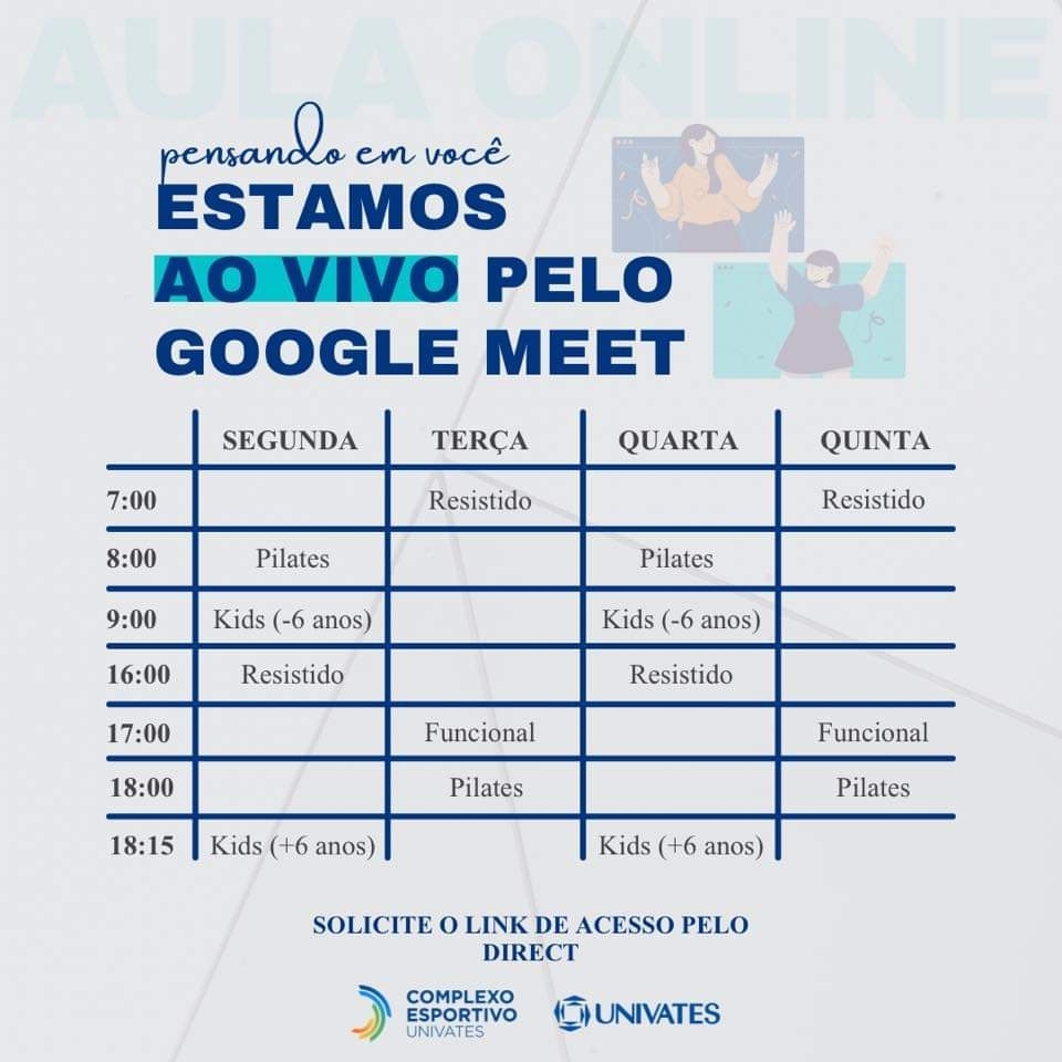 Todas as aulas podem ser acompanhadas pelo link meet.google.com/tzq-iprc-vav. Em caso de dúvidas, entre em contato pelo e-mail complexo@univates.br ou pelo WhatsApp (51) 9 9946-8116.