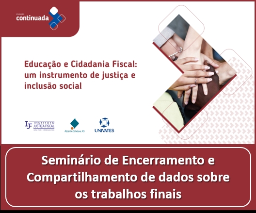 Na noite da última segunda-feira, 27, aconteceu o seminário de encerramento e compartilhamento de dados sobre os trabalhos finais do curso de extensão “Educação e Cidadania Fiscal: um instrumento de justiça e inclusão social”, promovido pela Universidade do Vale do Taquari - Univates, em parceria com a Receita Estadual e o Instituto Justiça Fiscal. Nove trabalhos foram apresentados pelos alunos, que partilharam suas pesquisas e aprendizados.