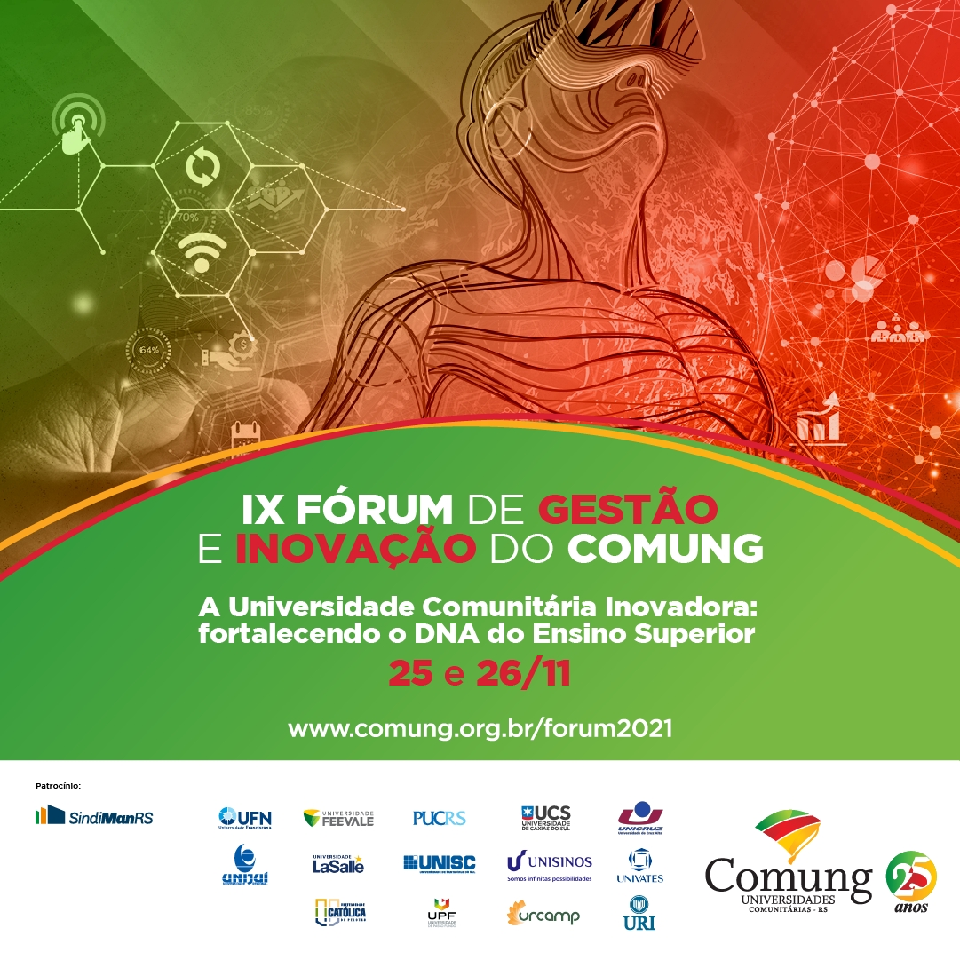 Buscando debater a inovação nas universidades comunitárias e fortalecer o DNA do Ensino Superior, a 9ª edição do Fórum de Gestão e Inovação do Consórcio das Universidades Comunitárias Gaúchas – Comung acontece nos dias 25 e 26 de novembro. A atividade objetiva socializar experiências nacionais e internacionais que envolvam as novas tecnologias educacionais, a formação empreendedora, as adaptações no período de pandemia e a relação das Instituições Comunitárias de Ensino Superior (Ices) com a sociedade e com a inovação. O evento também procura disseminar a cultura da inovação e do empreendedorismo com base em alianças estratégicas.