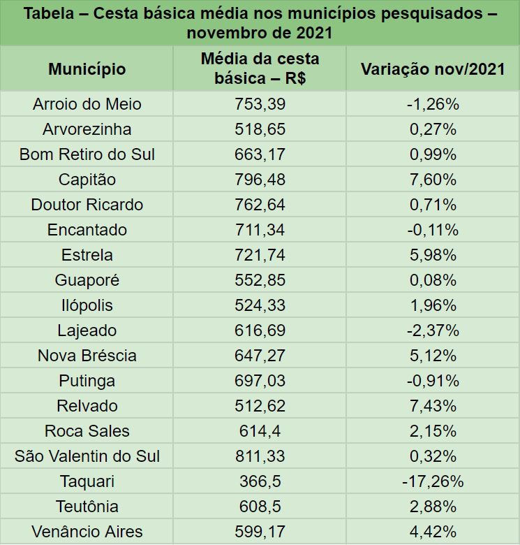 Como exemplo, em Lajeado ocorreram 14 coletas de preços em diferentes locais, resultando na média da cesta básica de R$ 616,69 (menor valor R$ 473,19 e maior valor R$ 877,89). Para efeitos comparativos, a cesta básica em Porto Alegre, conforme o Dieese, no mês de novembro, foi de R$ 685,32. Quanto à variação percentual do valor da cesta básica no mês de novembro em comparação a outubro, os maiores aumentos ocorreram em Capitão e Relvado (7,60% e 7,43%, respectivamente) e as maiores reduções percentuais foram em Taquari e Lajeado (-2,37% e -17,26%, respectivamente).