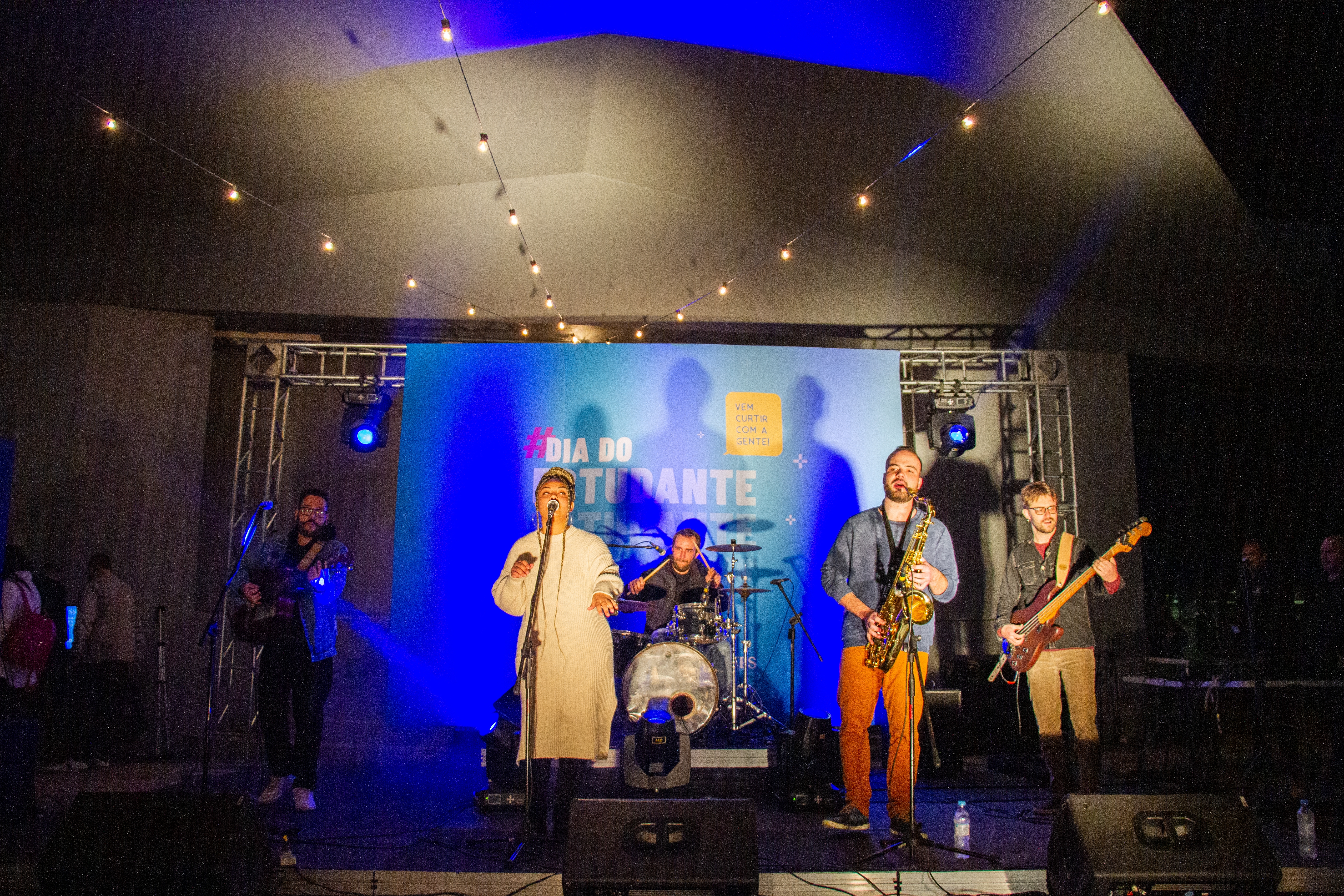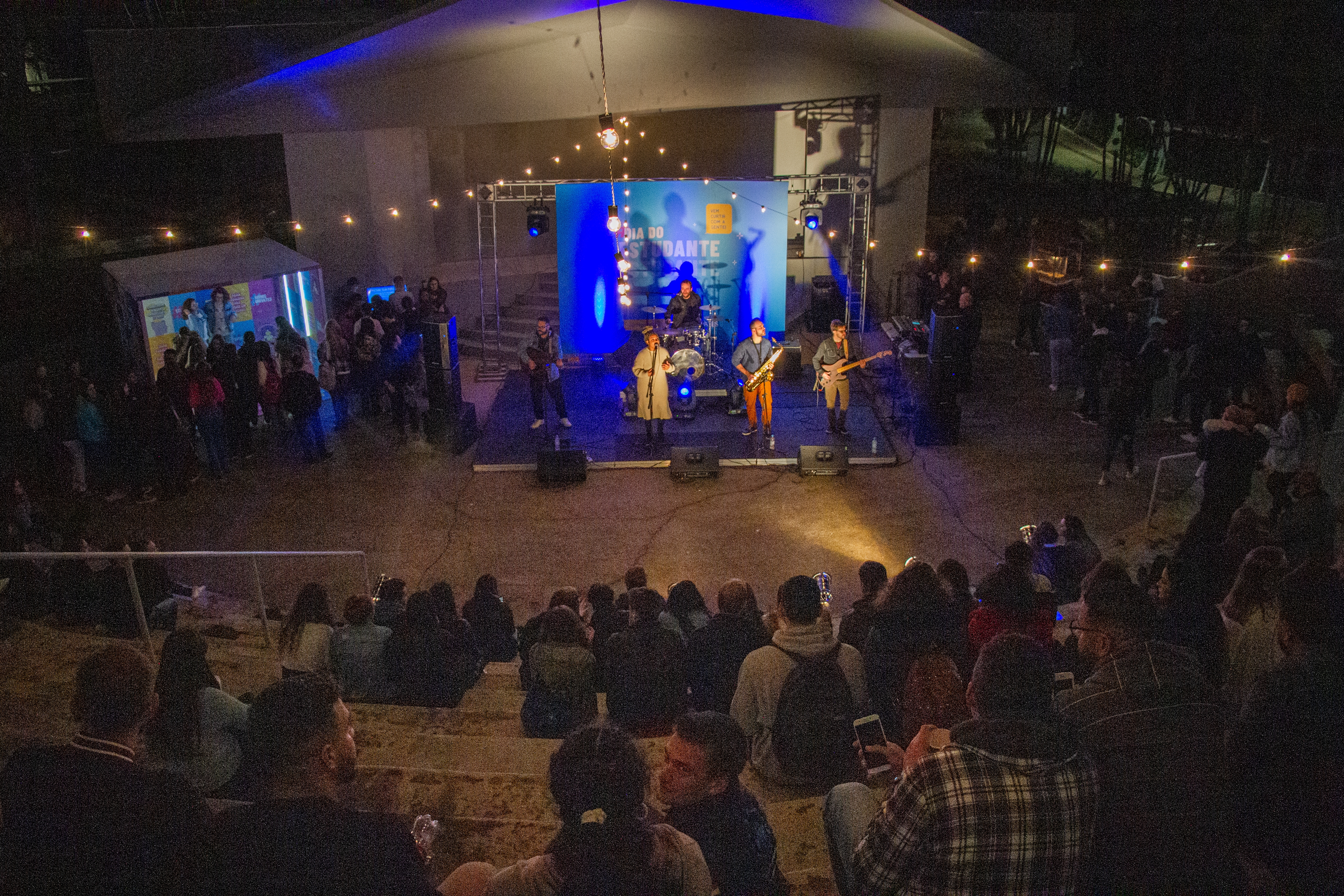 Estudantes e professores prestigiaram o show da banda Os Alquimistas, que apresentaram um repertório variado. “Anunciação”, “País Tropical”, “Zazueira” e “Deusa do amor” foram algumas das canções que embalaram a noite no Prédio 9. Para completar, houve distribuição de pipocas aos alunos.