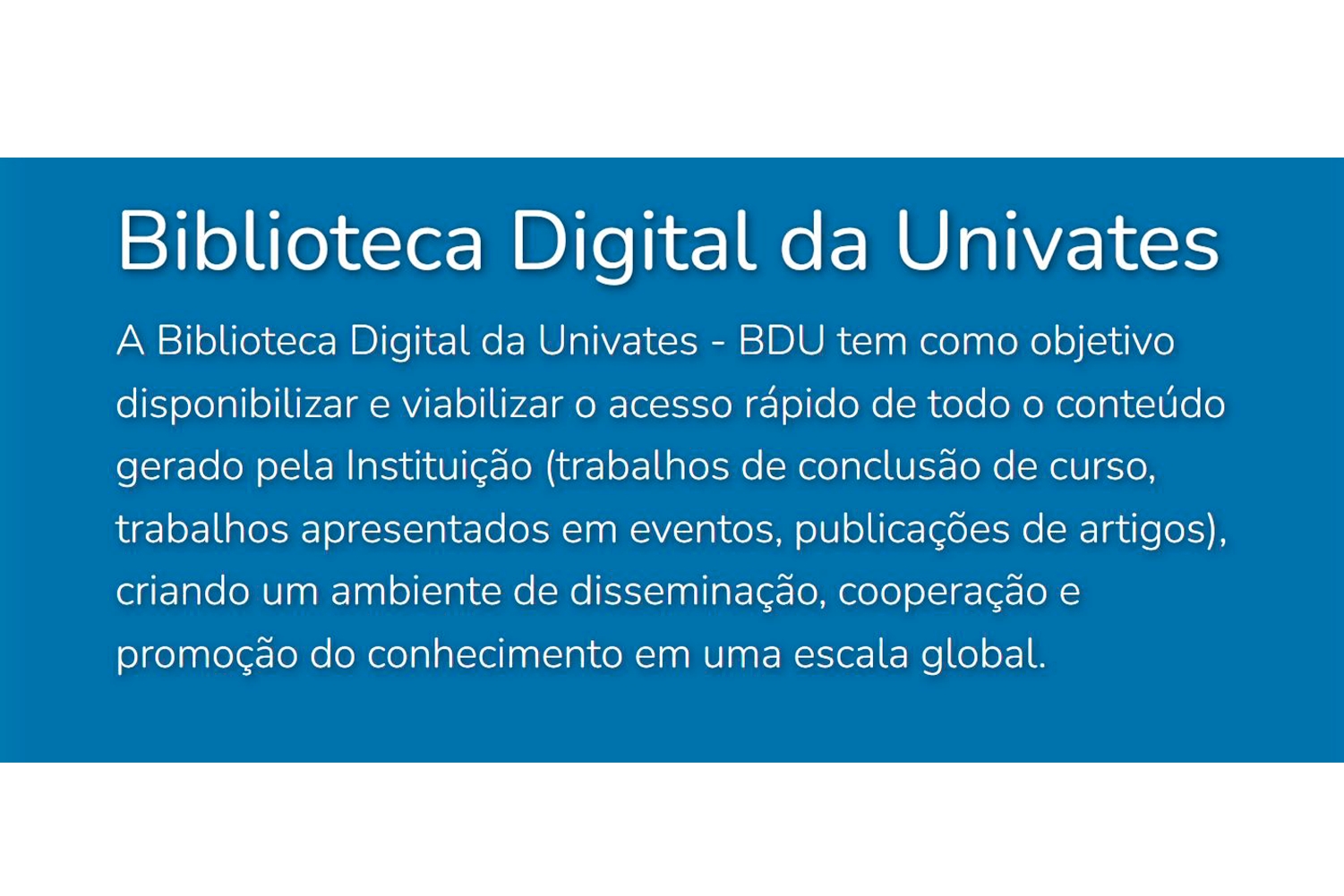 A Biblioteca Digital da Univates tem como objetivo disponibilizar e viabilizar o acesso rápido de todo o conteúdo gerado pela Instituição (trabalhos de conclusão de curso, trabalhos apresentados em eventos, publicações de artigos), criando um ambiente de disseminação, cooperação e promoção do conhecimento em uma escala global.