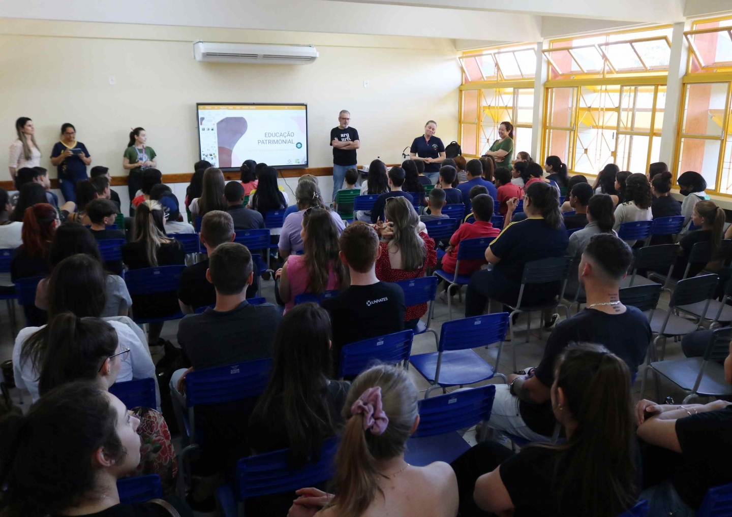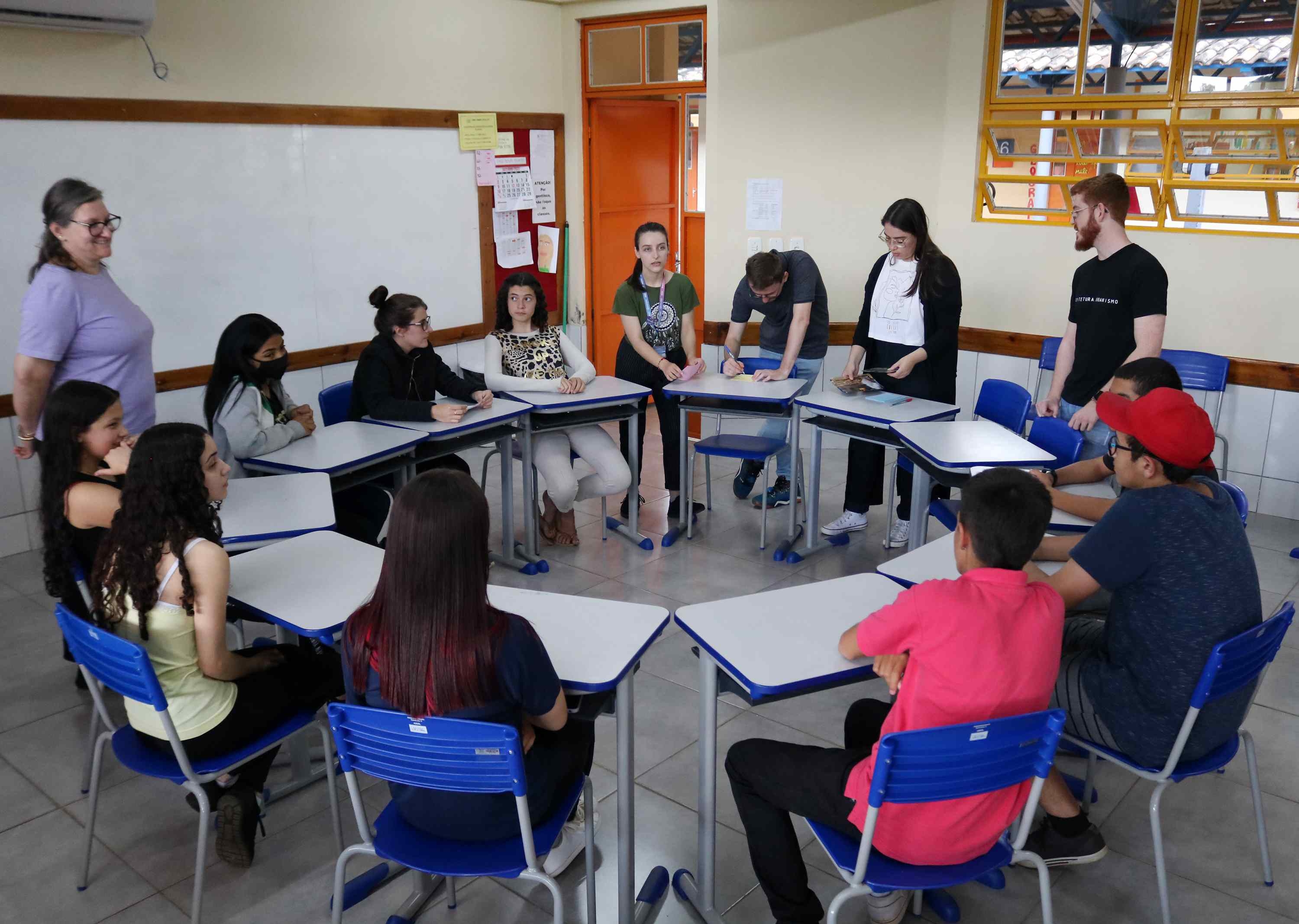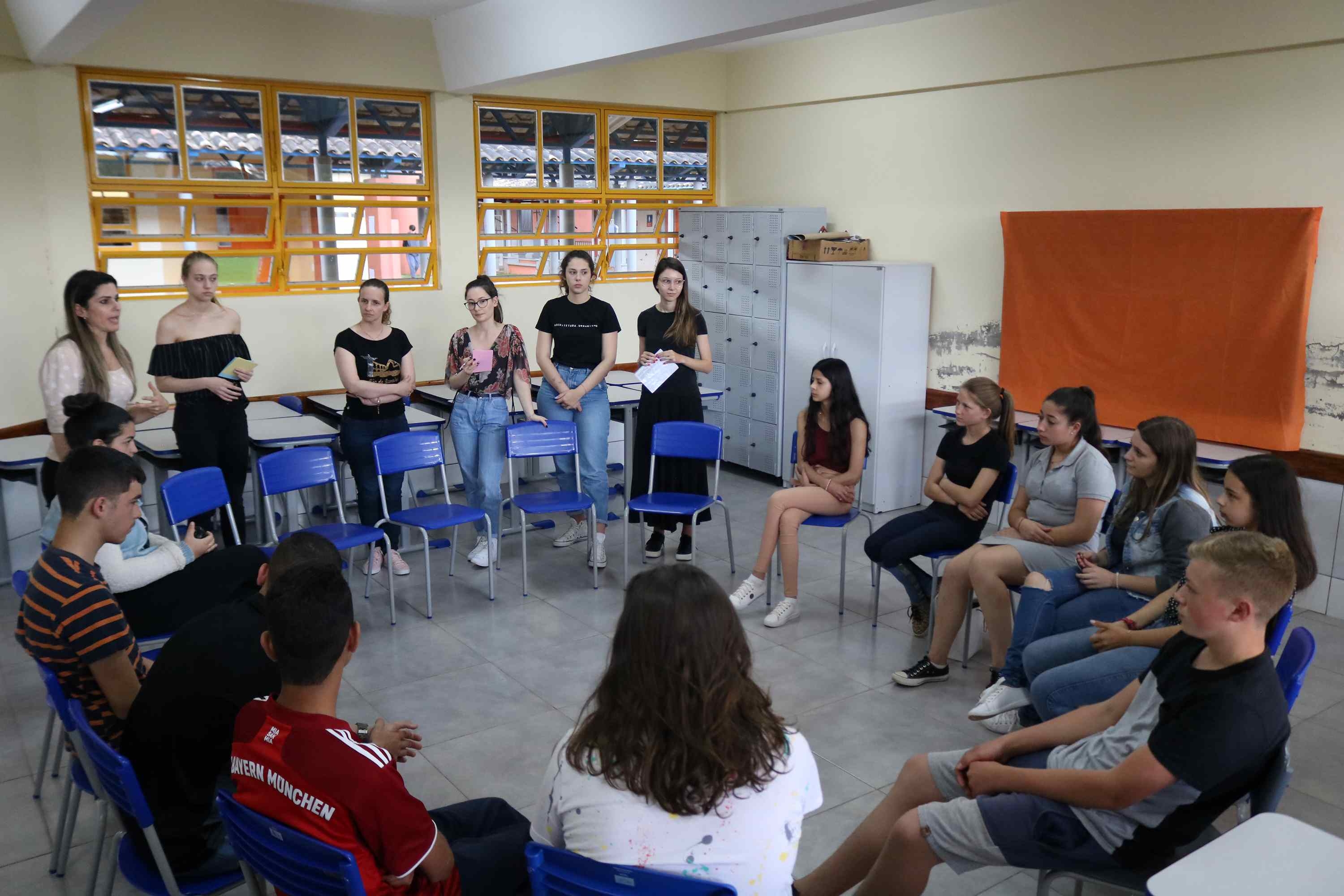 Após a apresentação do material, as acadêmicas do curso de Arquitetura e Urbanismo da Univates participaram de rodas de conversa com os alunos da cidade para troca de informações sobre a identificação de patrimônios culturais regionais e nacionais.