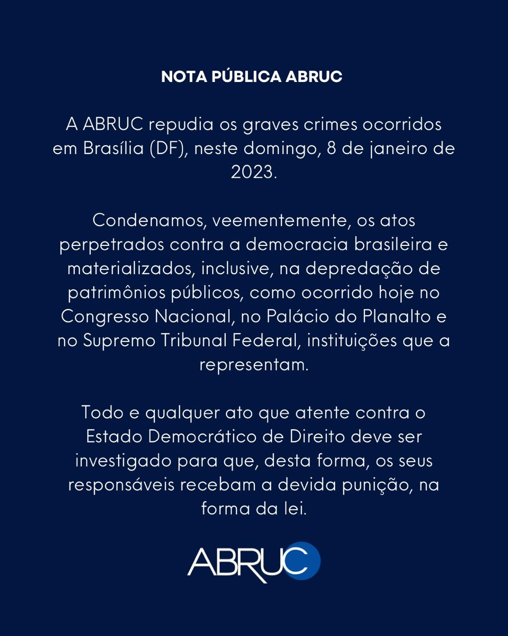 A Abruc repudia os graves crimes ocorridos em Brasília (DF), neste domingo, 8 de janeiro de 2023.