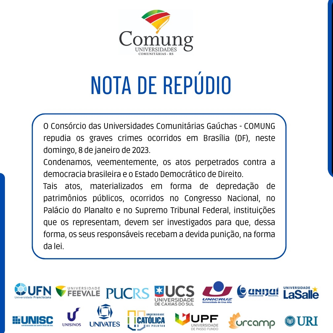 A Universidade do Vale do Taquari - Univates junta-se às mais de 70 universidades comunitárias filiadas à Associação Brasileira das Instituições Comunitárias de Educação Superior (Abruc) e às 14 instituições que fazem parte do Consórcio das Universidades Comunitárias Gaúchas (Comung), endossa e reproduz abaixo a seguinte Nota Pública: