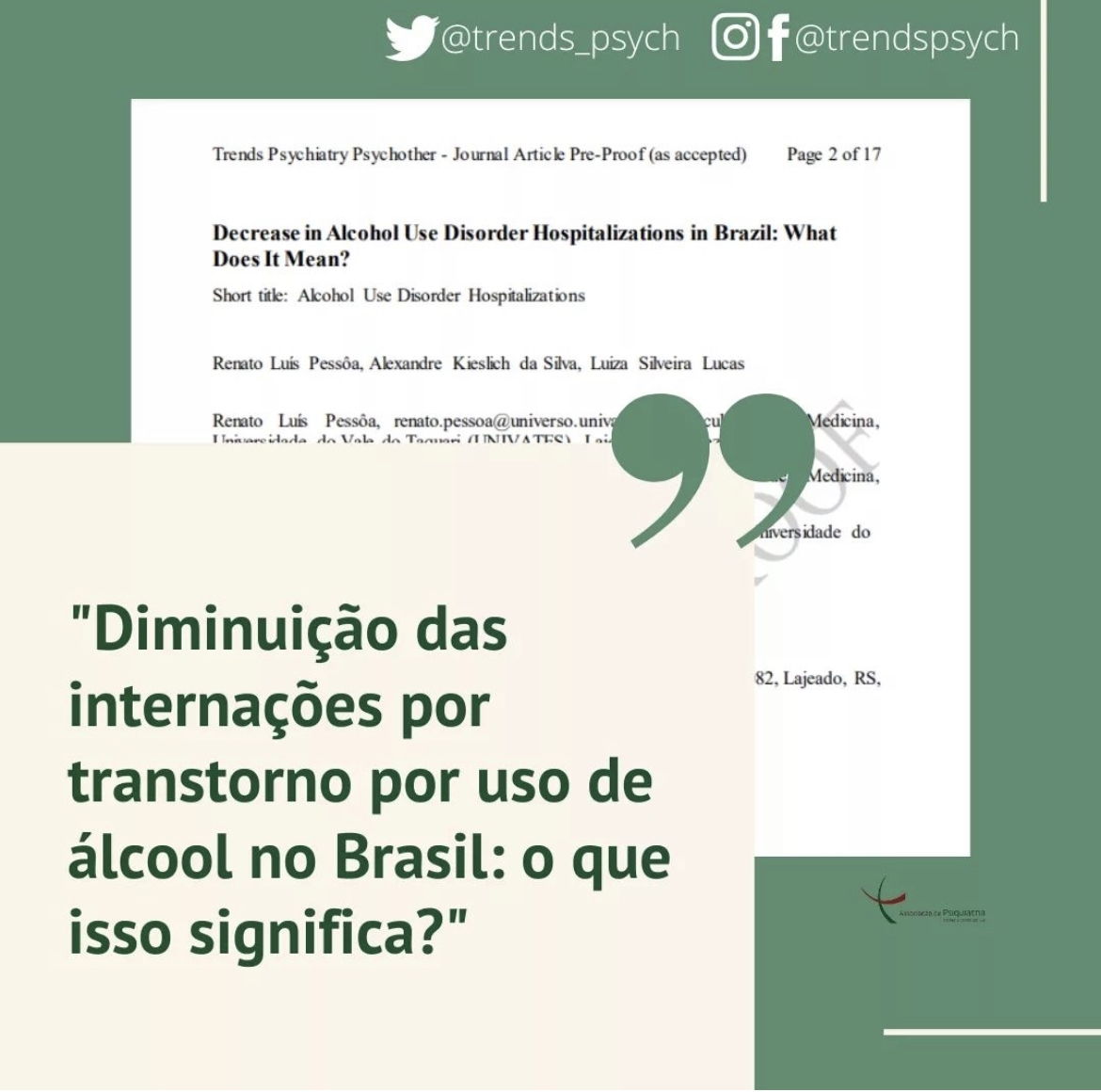 “A relevância do tema está no alto impacto causado pelas desordens do uso de álcool, que é uma das grandes causas de anos de vida perdidos por pessoas no Brasil. O conhecimento do sistema de atendimento a esses indivíduos é necessário ao profissional de saúde para poder fornecer o tratamento adequado para cada paciente”, informa Pessôa.