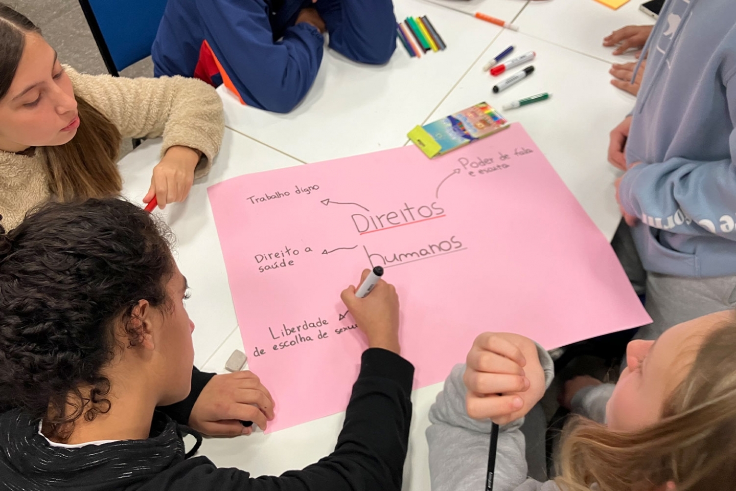 Na Sala Aula+, na Biblioteca, estudantes do ensino fundamental e da graduação compartilharam momentos de conversa e criatividade a partir do estudo da Declaração Universal dos Direitos Humanos.