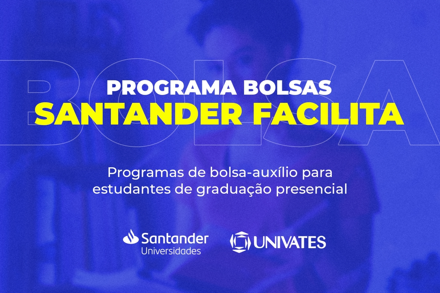Estudantes de graduação presencial da Universidade do Vale do Taquari - Univates têm até o dia 22 de janeiro para realizar a inscrição no Programa Bolsas Santander Facilita. Serão concedidas cinco bolsas-auxílio no valor de R$ 1.666,66 por mês, durante três meses, sendo duas delas destinadas para o público que se autodeclarar como preto, pardo, mulher ou pessoa com deficiência (PCD).