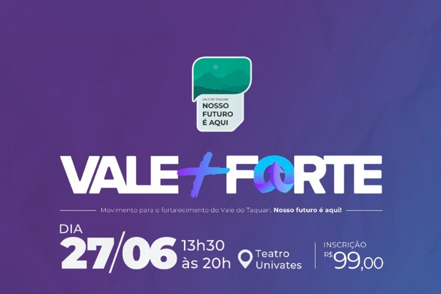 Empresários do Vale do Taquari, representando diferentes áreas de atuação, participarão de paineis e palestras no Teatro Univates, no dia 27 de junho, a partir das 13h30min. O evento "Vale+Forte" tem o objetivo de inspirar e fortalecer as empresas da região para a retomada da economia após as enchentes do mês de maio. A programação é uma realização de Lead08 e Seven Group e conta com apoio institucional da Associação Comercial e Industrial de Lajeado (Acil) e da Câmara de Indústria, Comércio e Serviços do Vale do Taquari (CIC-VT).