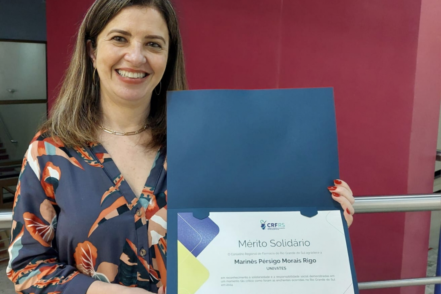 A professora Marinês Pérsigo Morais Rigo, coordenadora do curso de Farmácia, em nome da Univates, recebeu o Mérito Solidário em agradecimento pelos serviços prestados pela instituição durante o período de crise, marcado por enchentes e deslizamentos que devastaram várias regiões do Rio Grande do Sul. A cerimônia destacou a liderança, dedicação e os esforços da universidade, que mobilizou sua comunidade acadêmica e seus recursos para prestar assistência às vítimas da catástrofe.