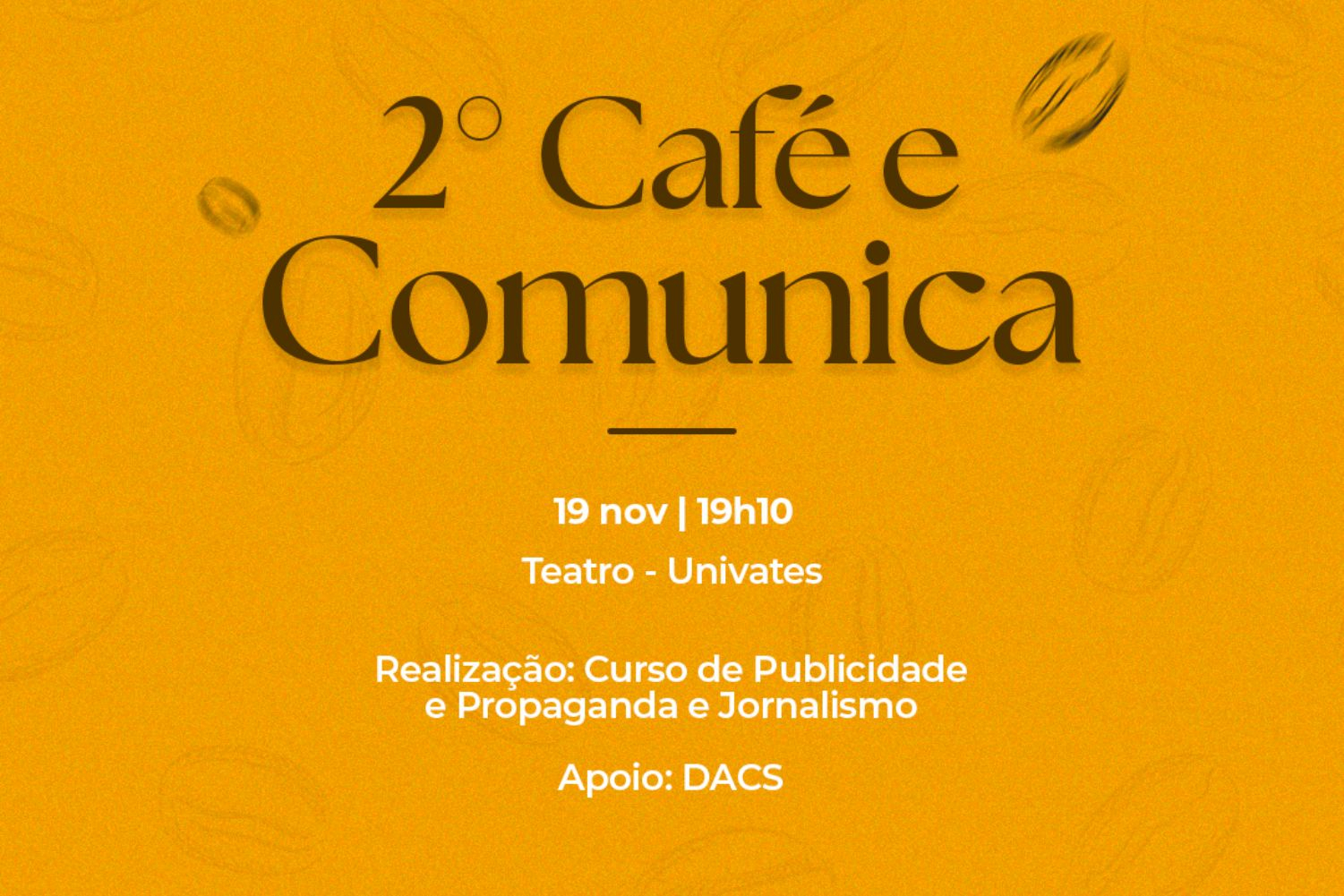 A segunda edição do Café e Comunica, atividade promovida pela área de Ciências Humanas e Sociais Aplicadas (CHSA) da Universidade do Vale do Taquari - Univates com apoio do Diretório Acadêmico dos Cursos de Comunicação Social (Dacs), acontecerá em 19 de novembro, das 19h10min às 20h45min, nas proximidades do Centro Cultural (no espaço entre o Teatro e a Biblioteca) da Instituição.
