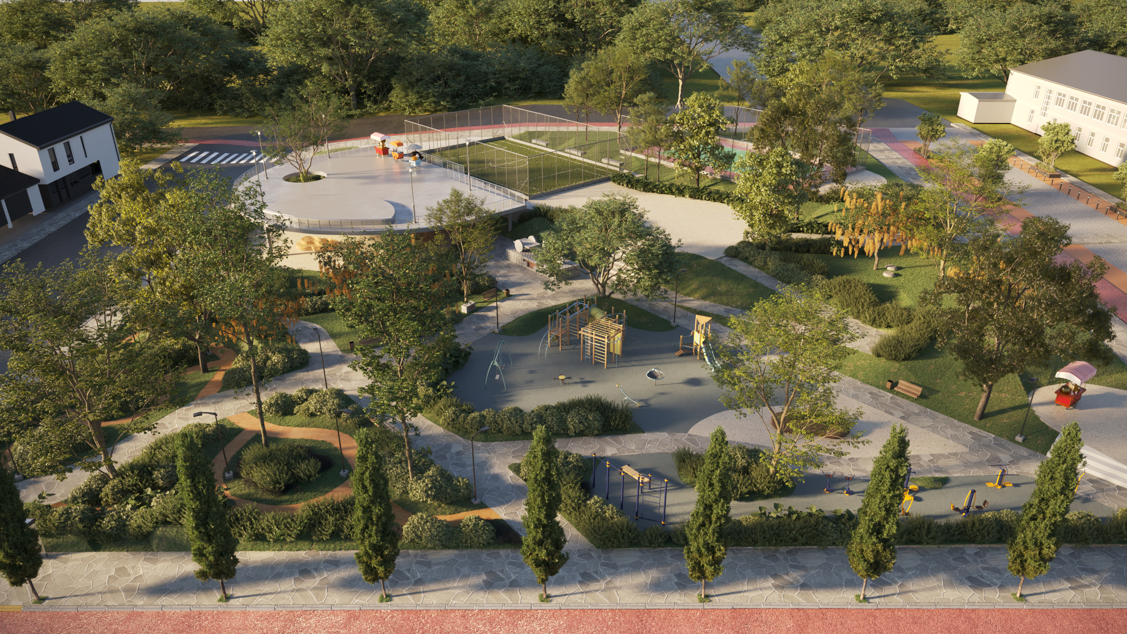 A acadêmica Larissa Camile Hauschild conquistou o primeiro lugar com uma proposta que prioriza a acessibilidade, a inclusão e a multifuncionalidade. Entre as principais intervenções sugeridas por ela destacam-se as rampas de acesso e melhorias na circulação interna, cobertura para a quadra de esportes e reorganização do playground.